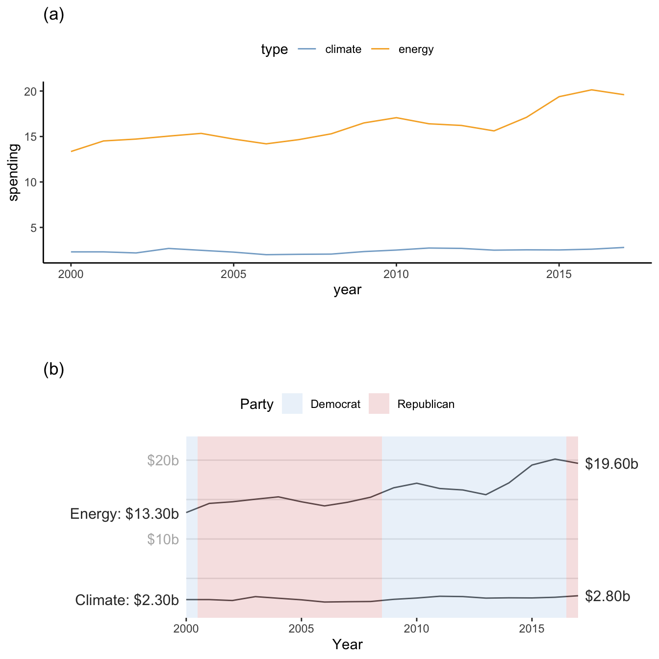 Figure 2.2: (a) An exploratory line plot and (b) an explanatory line plot showing the US government’s R&D spending on climate and energy in billions USD. The background in (b) is colored by the political party that is in office.