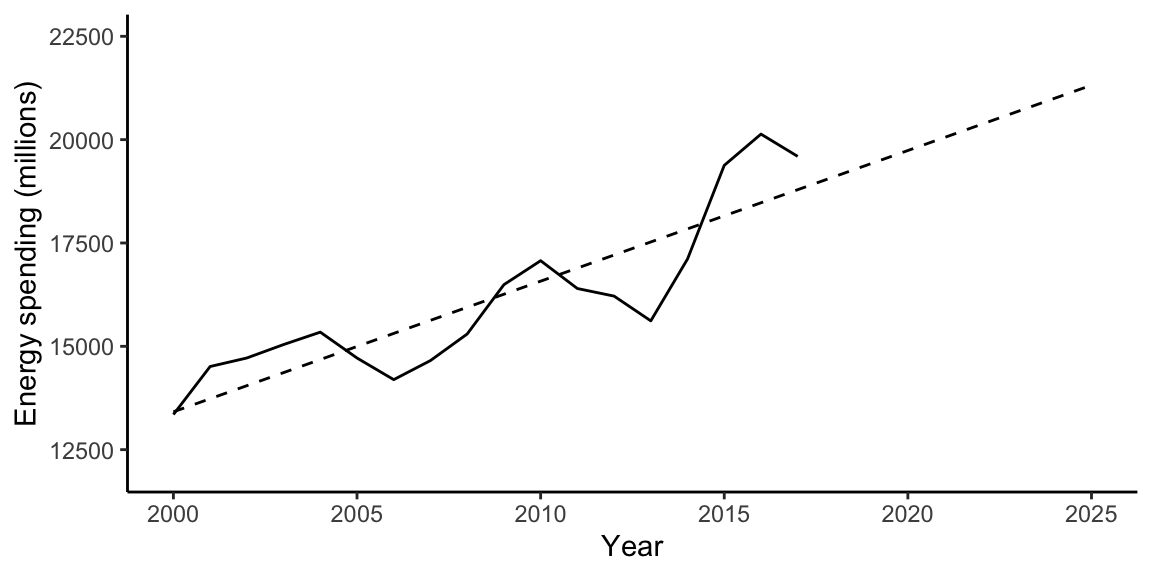 Figure 2.3: Government R&D spending on energy from 2000 to 2017 with a predicted spending trend overlaid as a dotted line.
