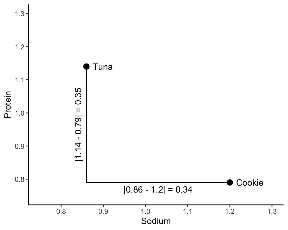 The Manhattan distance (Box 7.3; also called the L1 distance for the mathematically inclined) between two food items involves calculating the absolute value of the difference between the individual nutrient measurements and adding all these differences together. For the tuna and cookie food items in Table 7.1, the Manhattan distance (\(d_1\)) is calculated as