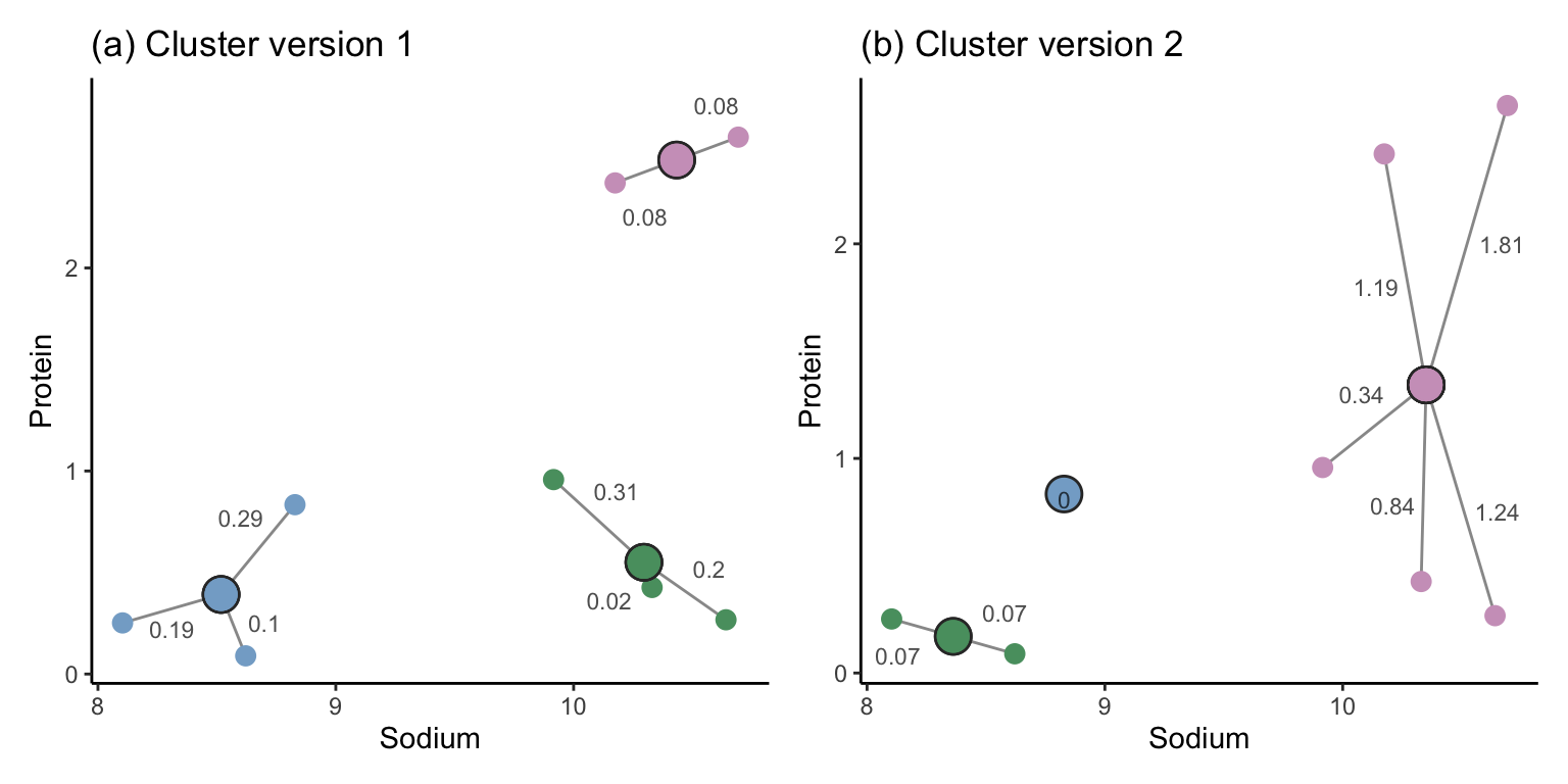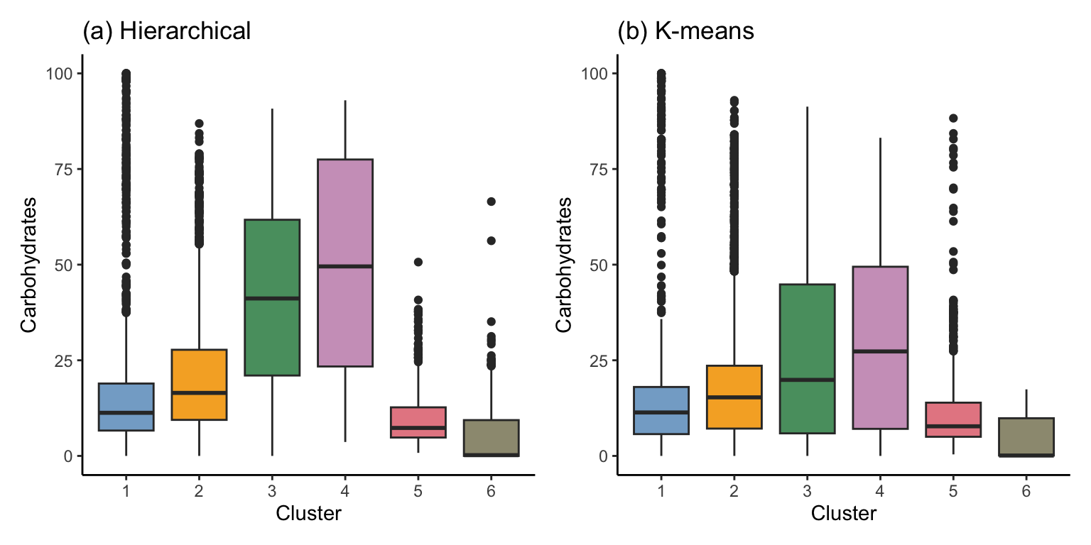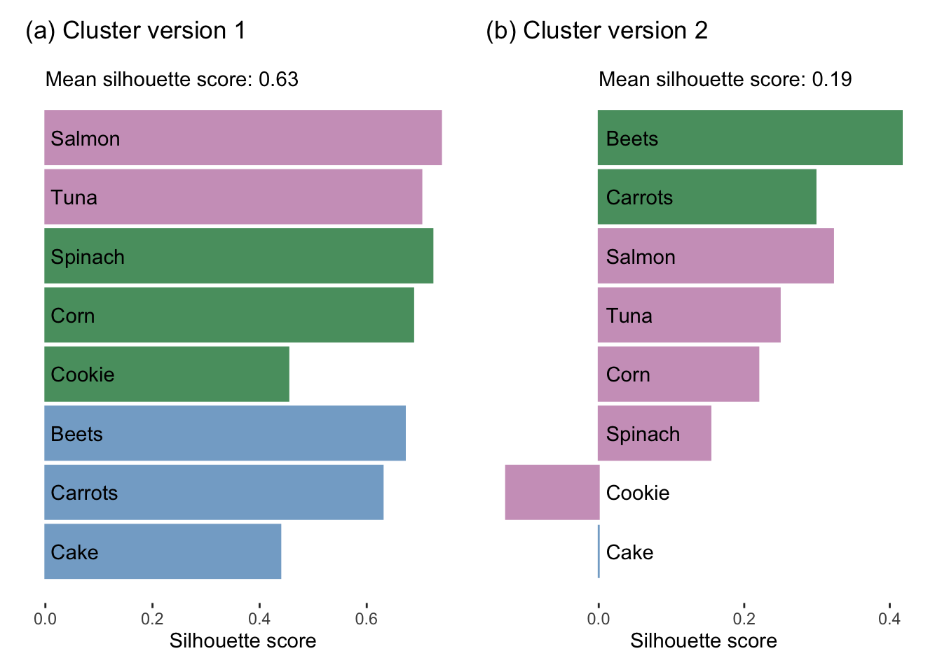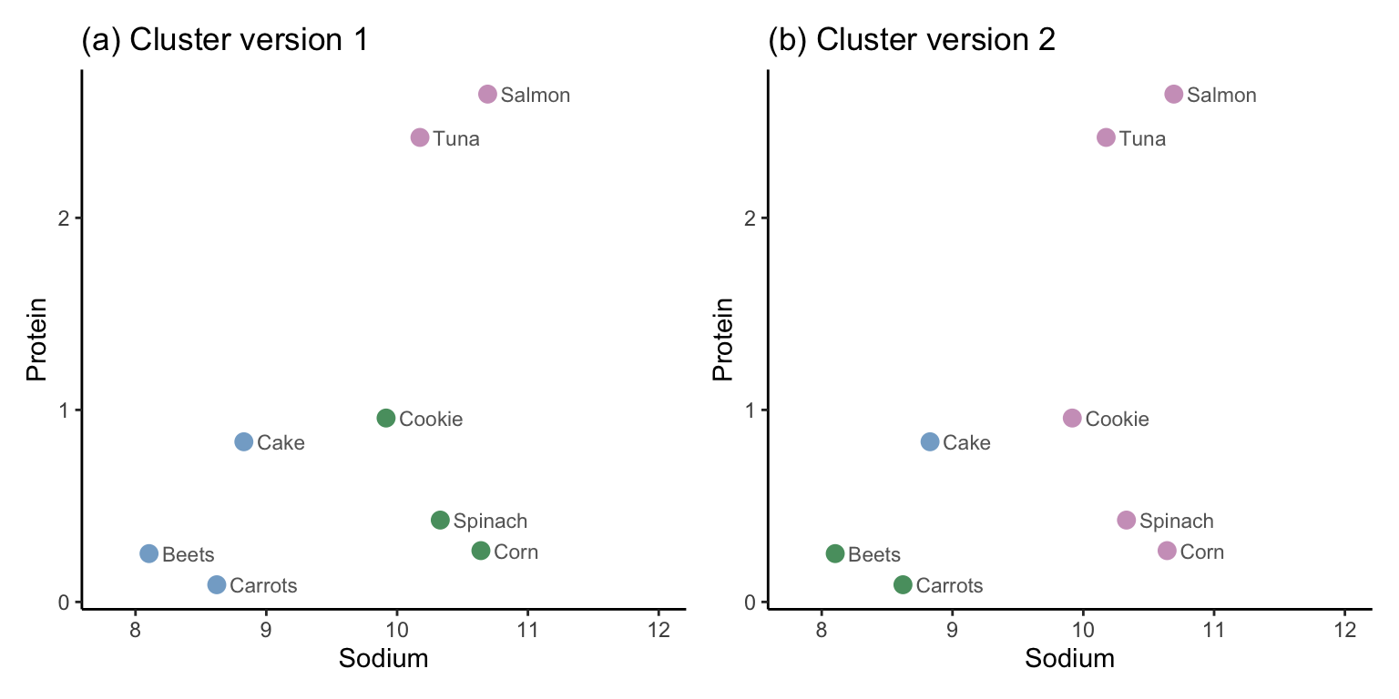 Since we typically don’t know in advance what clusters we will find in our data (i.e., there are usually no “ground truth” clusters), it is hard to evaluate whether the clusters we identify are correct. In the case of food items, perhaps we could try to use the US Department of Agriculture’s food groups as the ground truth. The current food groups are (1) fruits; (2) vegetables; (3) grains (cereals); (4) protein (meat, seafood, poultry); (5) dairy; and (6) confections. However, even these generally accepted food group definitions have a complex history. In 1943, seven food groups were proposed, which were soon reduced to four groups in 1956, before being expanded back to six groups, and eventually being shaped into the familiar “food pyramid” in the 1990s (Nestle 2013). These food groups clearly lack stability, and they certainly don’t represent a ground “truth.” Even if we did want to use these existing groups to organize our food items, doing so would require that we spend days manually assigning each of the thousands of food items in the data to a food group. This would be a challenging task, especially because these traditional food groups don’t even make sense for many of the food items in our data (what food group should “Pizza, cheese, from restaurant or fast food, thin crust” be in?)