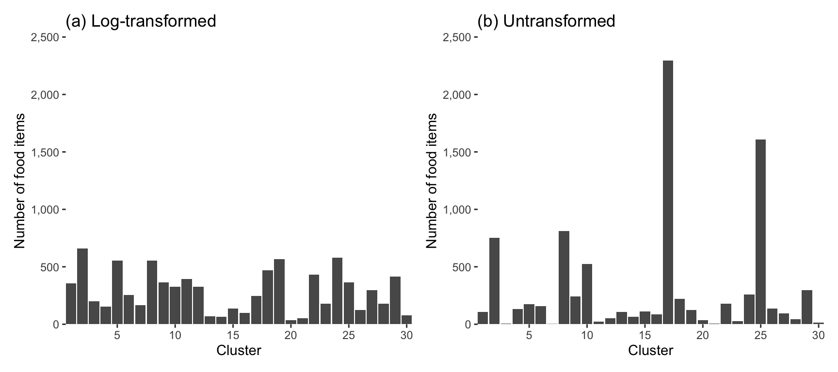 Further exploration of the clusters computed using the untransformed variables quickly reveals that they are not as “meaningful” (assessed subjectively) as the log-transformed clusters. The bar chart in Figure 7.28 shows the number of observations in each cluster when we do and do not log-transform the nutrient variables. Note that the sizes of the clusters based on the log-transformed data are much more even, whereas around half of the food items all ended up in one big cluster when they were computed using the untransformed data (which is not ideal). Moreover, looking at the food items in the clusters based on the untransformed data, we found that the two largest clusters did not have a clear theme, while the remaining clusters had similar themes to those that we found based on the log-transformed data, such as “vegetables”, “seafood”, and “cereals.”