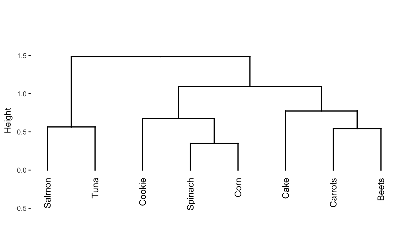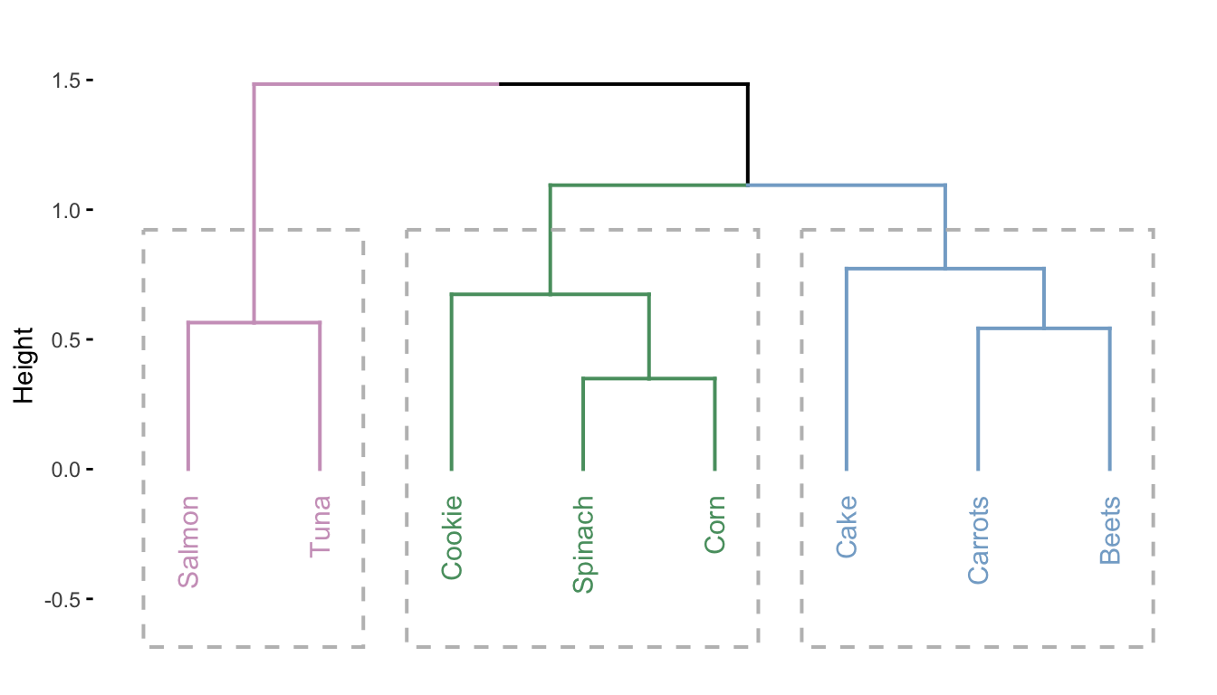 The dendrogram itself is a very useful tool for understanding the relationships between the different food items since foods that appear close together in the dendrogram are considered to be more similar to one another. To explicitly generate a set of \(K\) clusters, you can “sever” the dendrogram at a specified height, and define the set of clusters based on the separation of the observations below this height. For instance, if we sever the dendrogram at a height of around 0.95, we get the three clusters highlighted in Figure 7.10. Can you identify where to sever the dendrogram to generate a set of \(K = 2\) clusters? What are the two clusters that result? What about \(K = 4\)?