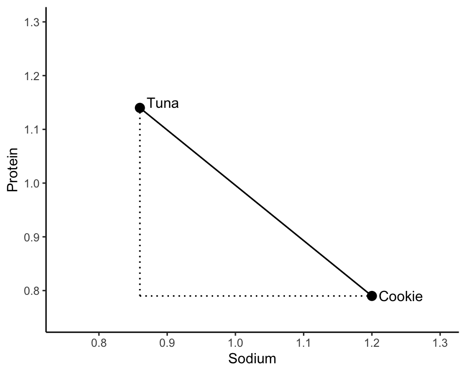 You might remember from high school that Pythagoras’ theorem says that the Euclidean distance between the tuna and cookie food items (from Table 7.1) can be computed as