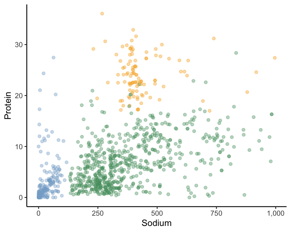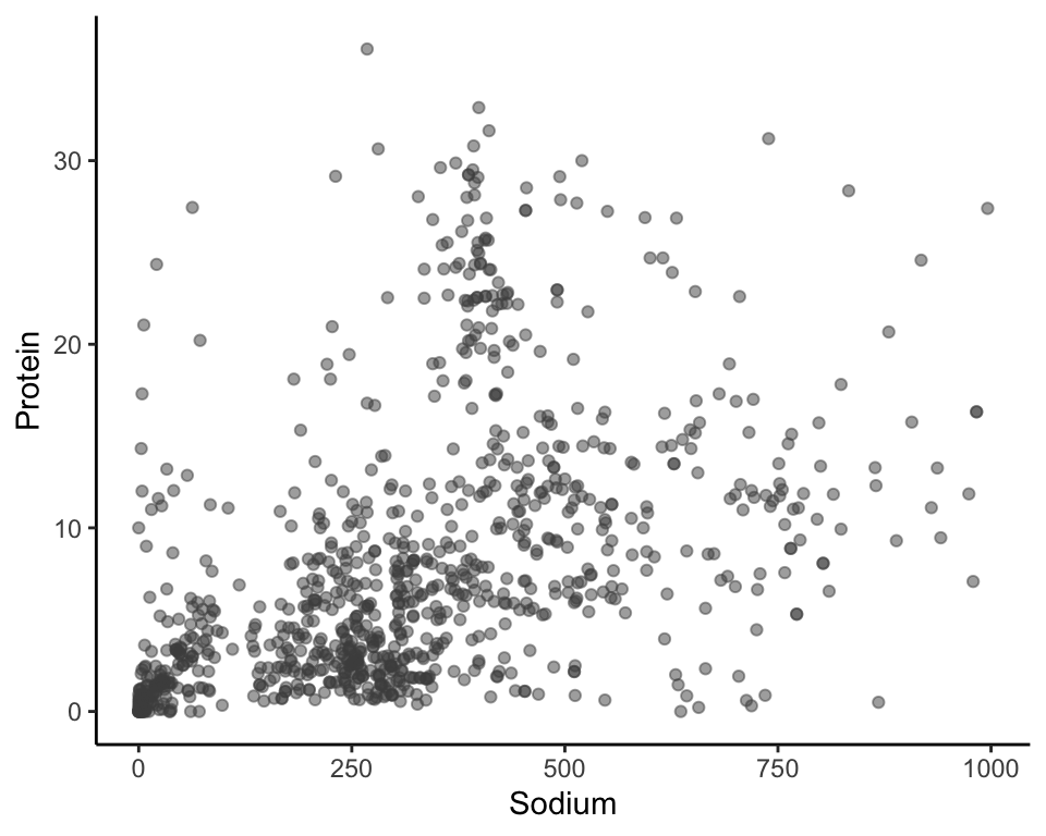 To formally introduce the idea of data-driven clusters, let’s consider an example from our food dataset based on just two nutrient variables: “sodium” and “protein.” Figure 7.1 displays 1,000 food items in the two-dimensional sodium-versus-protein scatterplot. Can you visually identify any groups of data points (i.e., data points that seem to be grouped together)? How many groups/clusters can you see?
