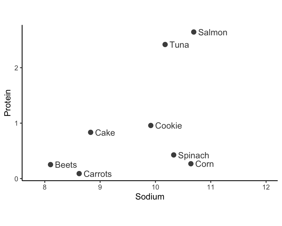 dist()function in R (themethodargument of thedist()function has a “euclidean” and a “manhattan” option). In Python, you can use themetrics.pairwise.distance_metrics()function from the scikit-learn library.If the standard deviation of the iron, sodium, and protein nutrient variables are \(3.7\), \(320.0\), and \(7.9\), respectively, recompute the Euclidean distance and the Manhattan distance using the SD-scaled variables. Do the relative distances change? If so, explain why.