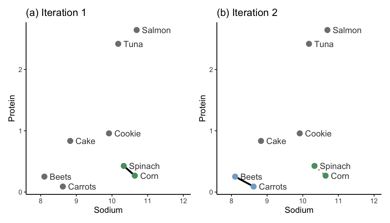 Iteration 2: Find the second most similar pair of clusters, and merge them too. In Figure 7.7(b), this step merges the clusters of the beets and carrots data points.
