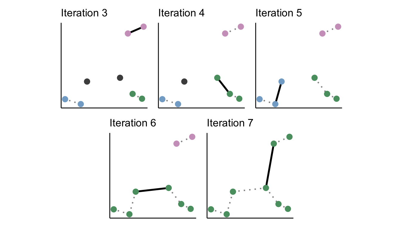 Subsequent iterations: Continue iteratively merging the next most similar pairs of clusters until all the observations are in the same cluster. Figure 7.8 shows iterations 3–7.