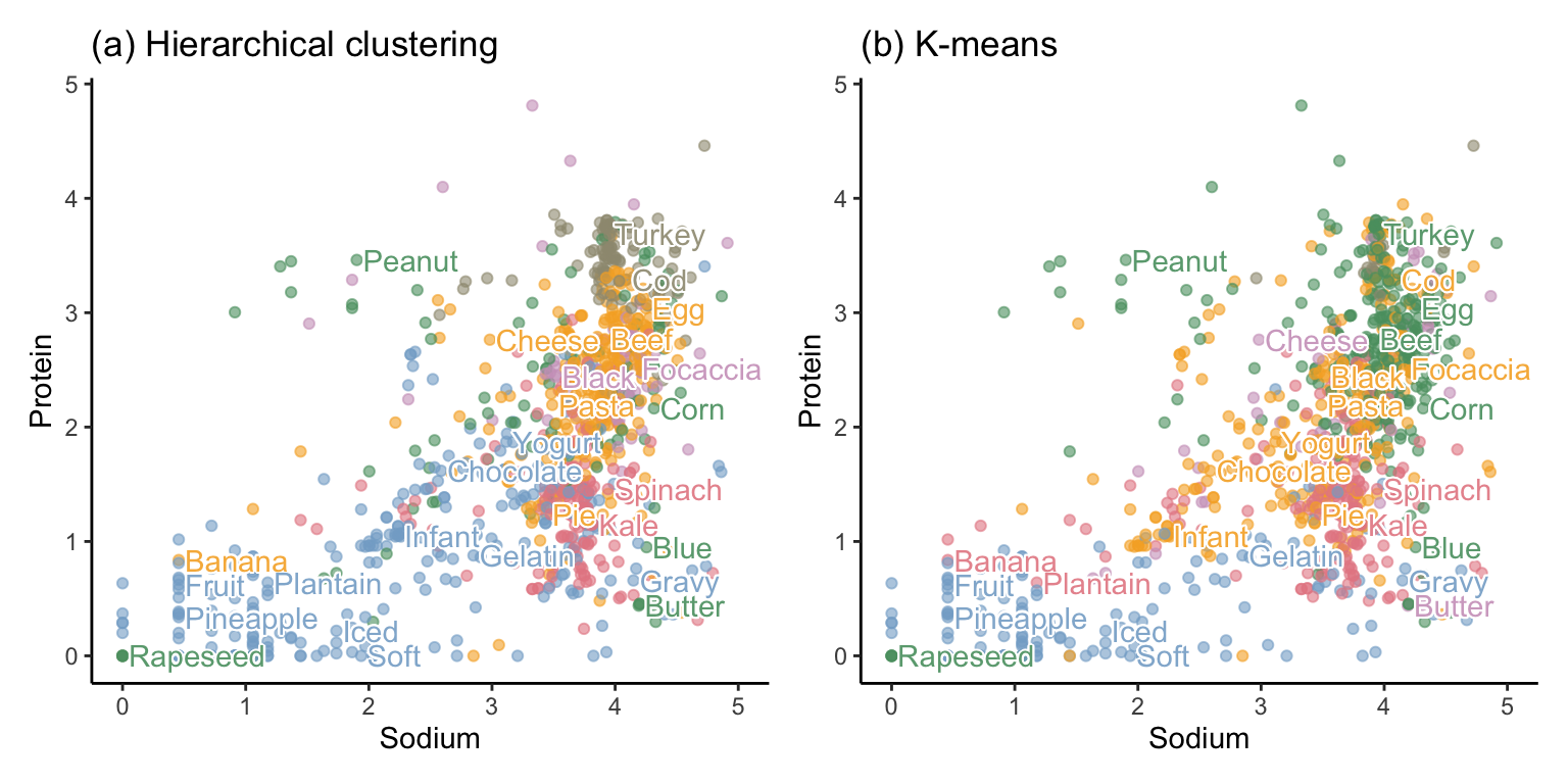 04_clustering.qmd(or.ipynb) file in the relevantnutrition/dslc_documentation/subfolder of the supplementary GitHub repository, you will find a section labeled “[Exercise: to complete]”. In this section, write some code that applies the K-means and hierarchical clustering algorithms to cluster the nutrients/columns (rather than the food items/rows) using correlation as the similarity measure. Compare your results to the nutrient groups that we used in Chapter 6 (you can base your choice of \(K\) on these original nutrient groups). Hint: in R, both thekmeans()andhclust()R functions accept a custom distance matrix and you can convert a correlation matrix to a distance matrix (in which smaller numbers should mean “more similar”) using \(1 - |\textrm{cor}|\).Apply the hierarchical clustering and K-means algorithms (with \(K = 30\)) to cluster the food items using the principal component-transformed dataset that we computed in Chapter 6. Compare the results with the clusters computed on the original data.