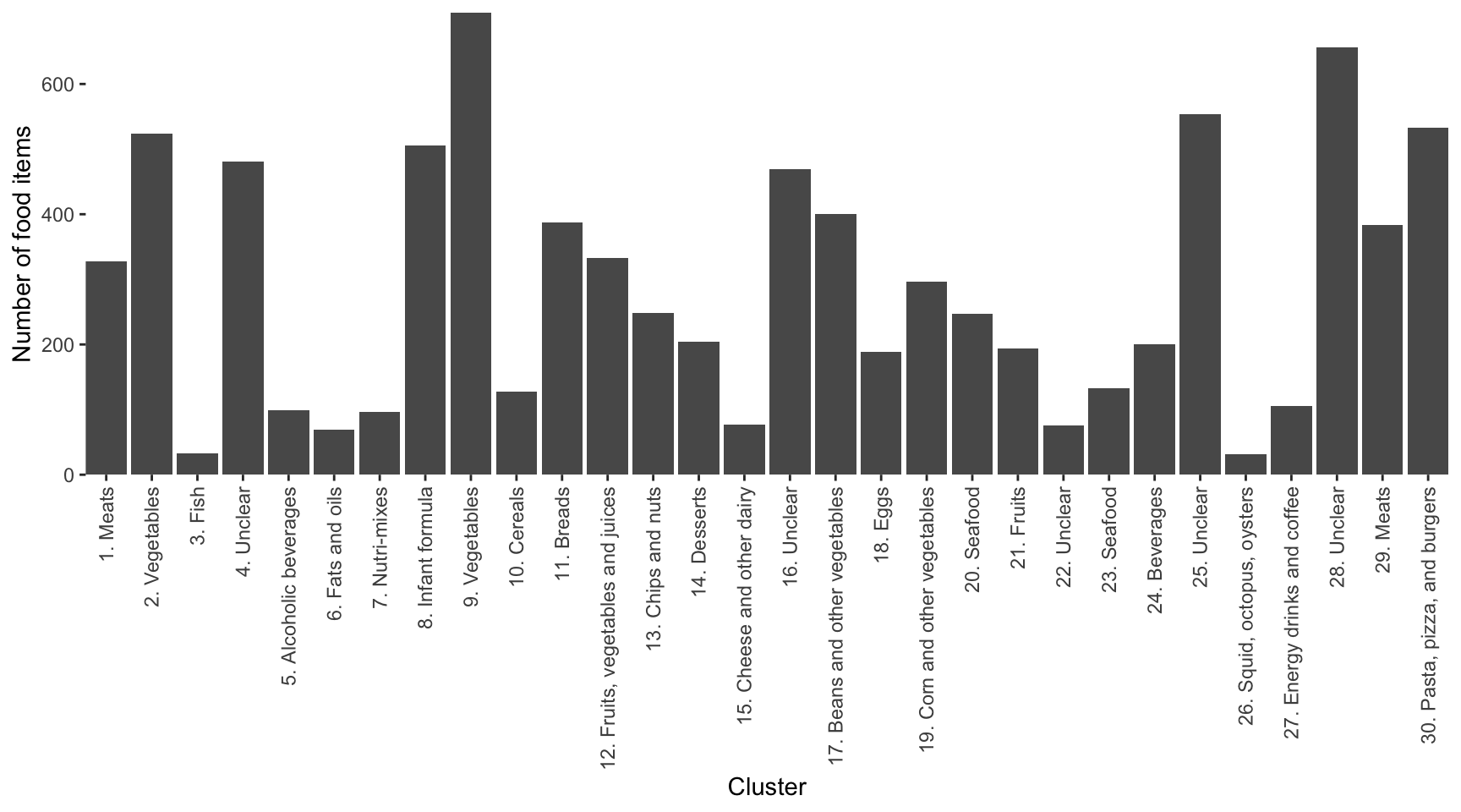 In Table 7.8, we demonstrate our first attempt to use these 30 clusters to categorize the foods in our app while also using the principal component summary nutrient variables that we created in Chapter 6 to provide some interpretable nutritional information. The cluster categories shown in Table 7.8 are far from perfect. One idea for further improving these automated cluster labels is to implement an additional layer of clustering within the “Unclear” clusters to further attempt to identify the cluster categories of these uncategorized food items. This is left as an activity for the ambitious reader.