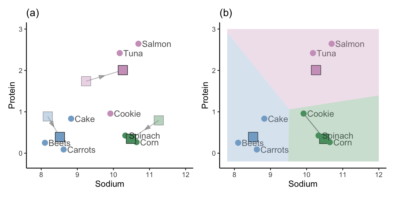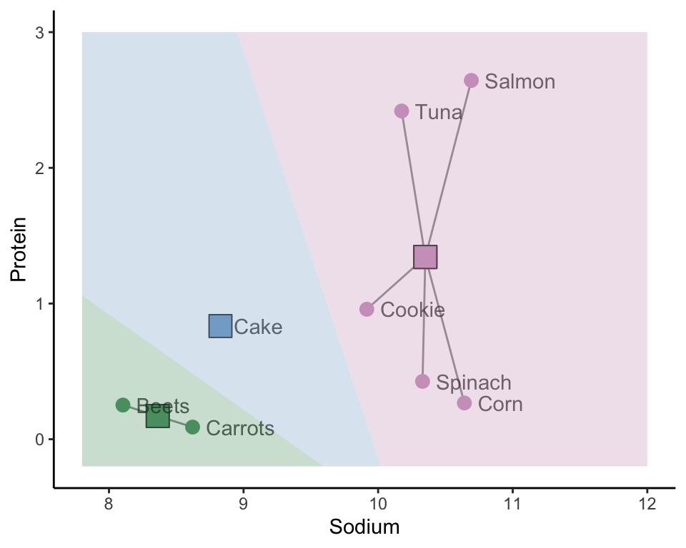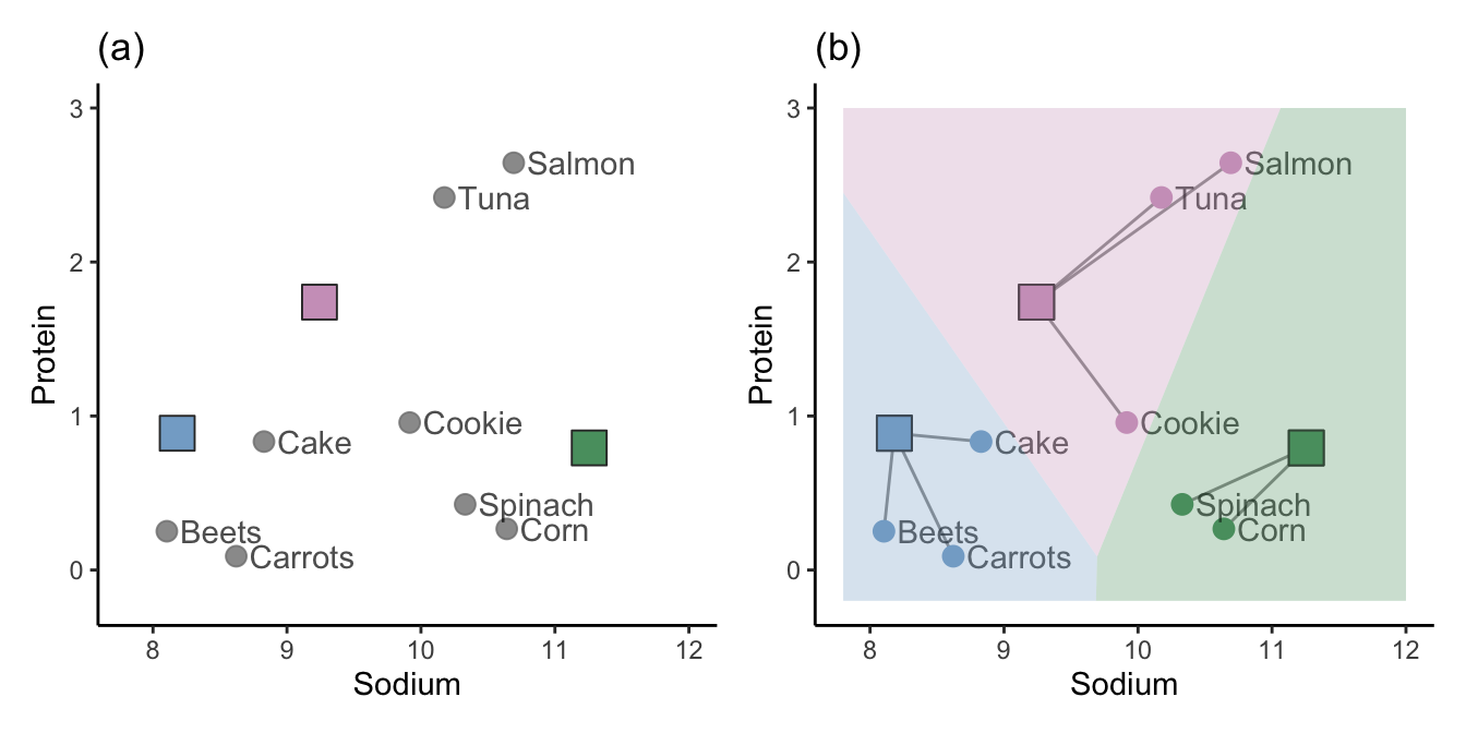 The next step is to assign the initial cluster membership of the data points based on which of the initial cluster centers they are most similar to. We will use the Euclidean distance to define similarity for this example. Figure 7.11(b) shows the initial cluster membership for each of our eight food items based on the three random initial cluster centers, where we use color and line segments to indicate which cluster the data points are placed in. The background of Figure 7.11(b) is colored based on the cluster membership that a corresponding data point in each location would have.
