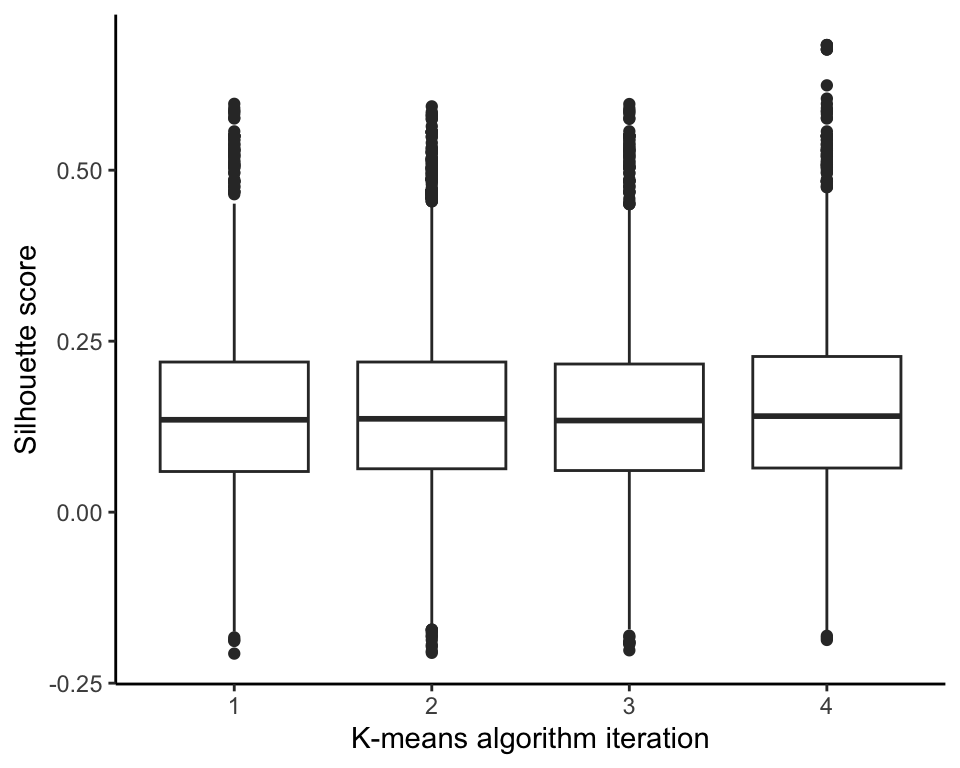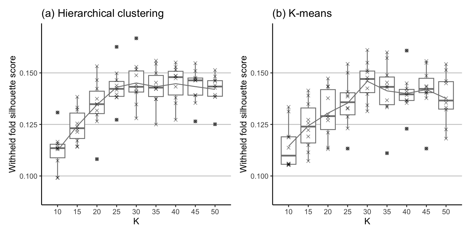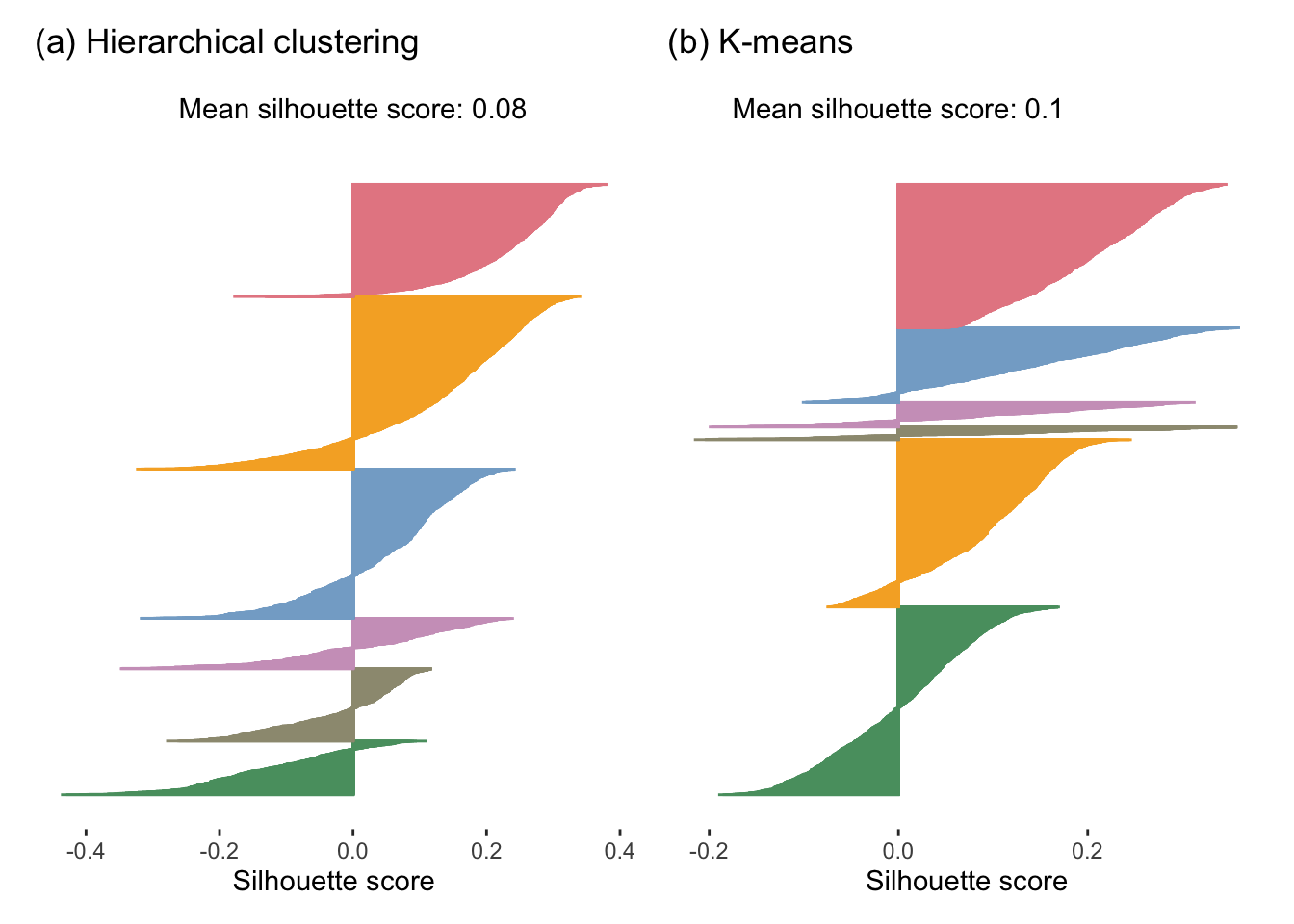 The silhouette score can be used to compare two sets of clusters that each consist of different numbers of clusters, \(K\).
