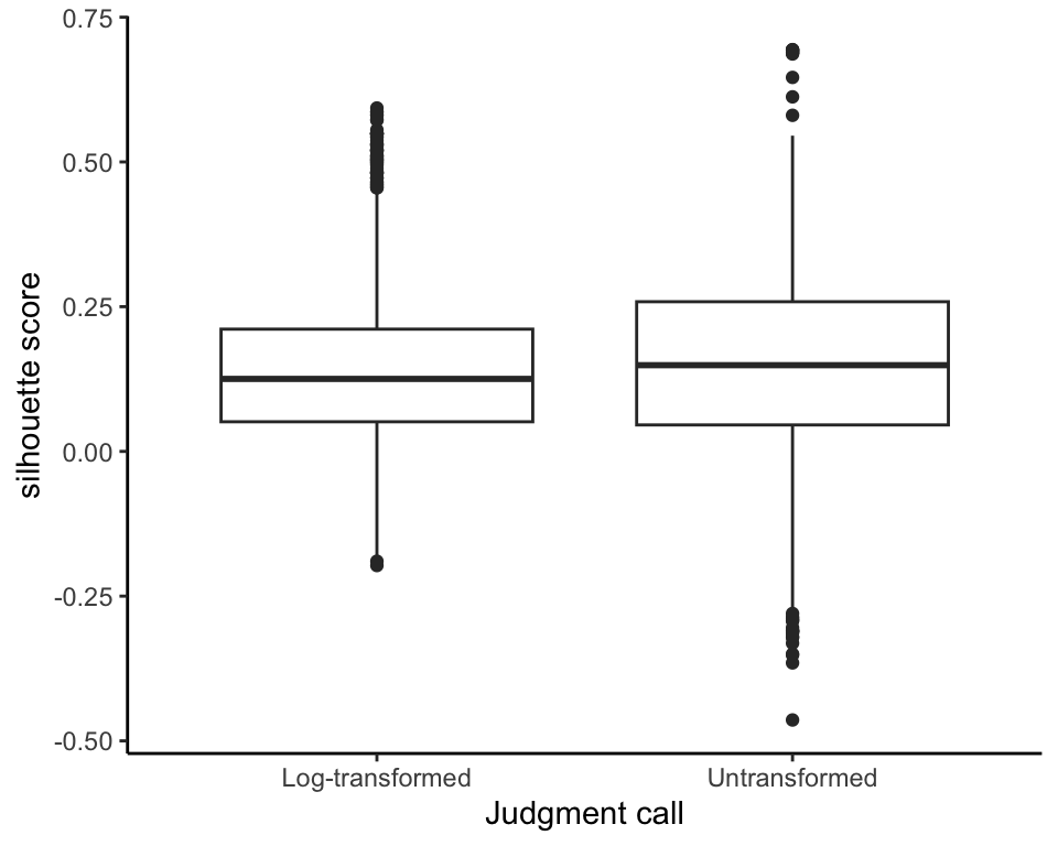 Our clusters do not seem to be stable to our judgment call to log-transform our data. Since we get more meaningful clusters when we log-transform our data versus when we don’t, we will continue to focus on the clusters computed based on the log-transformed data.