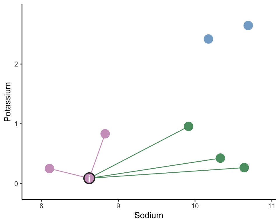 The definition of the similarity measure that you choose is a judgment call that should be informed by domain knowledge whenever possible. For instance, defining similarity using the Manhattan (L1) distance metric typically makes more intuitive sense if you want to tally up the individual differences across each dimension, as is sometimes the case for count data. However, for our SD-scaled nutrition measurements, the direct Euclidean (L2) distance feels more intuitive (the Euclidean distance is also more common). If you’re not sure which metric to use for your project, you can make a judgment call and investigate the downstream impacts of your choice. Perhaps your results will be stable across the choice of similarity measure, or perhaps one will lead to more meaningful results than the other.