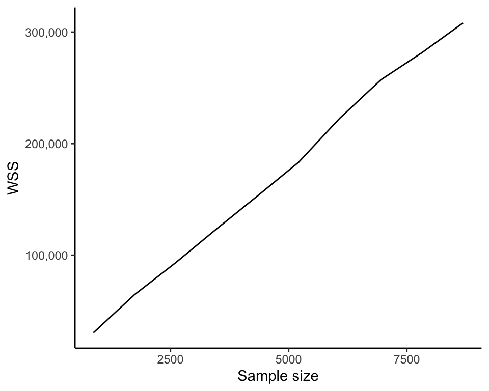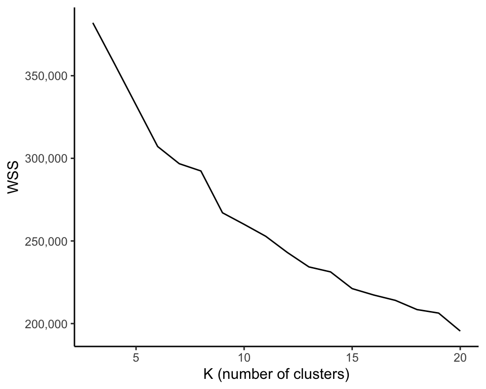 The WSS can be used to compare two sets of clusters that each consist of different numbers of clusters, \(K\).