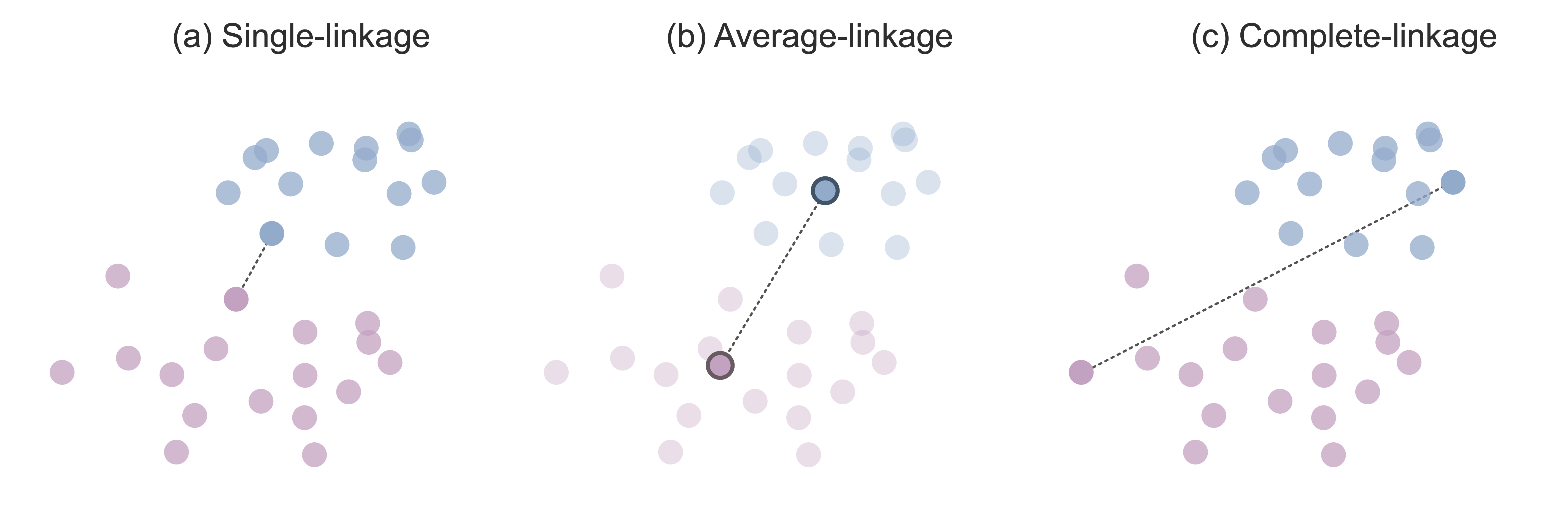 This hierarchical clustering algorithm involves iteratively merging the clusters of the most similar pairs of clusters. From Section 7.1.2, we know what it means for two data points to be similar to one another, but what does it mean for a pair of clusters to be similar to one another?