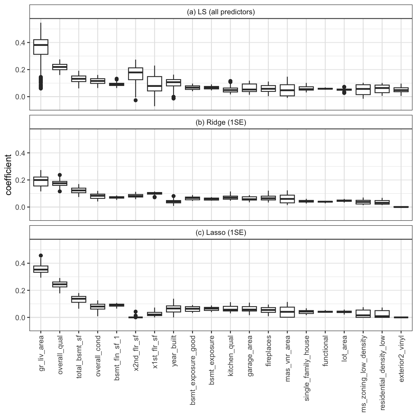 Figure 10.14 shows the distribution of the data cleaning/preprocessing judgment call-perturbed coefficients for the 20 features with the largest (absolute value) magnitude. Since the boxplots for the unregularized LS fit in panel (a) are generally wider than their regularized counterparts in panels (b) and (c), this figure reinforces the notion that regularization improves the stability of the LS fits.