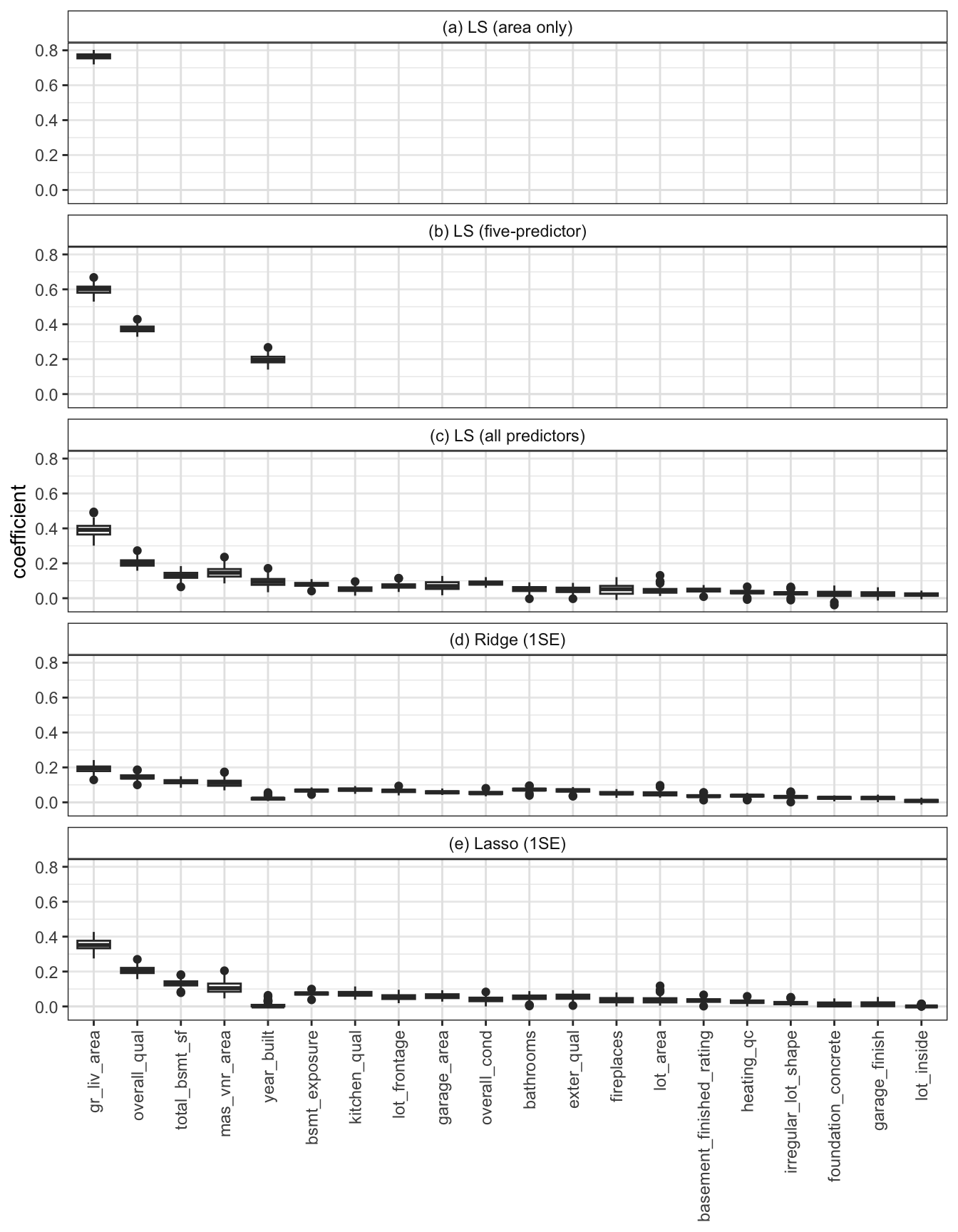 The data perturbations that we used to produce these plots are the same as those we used in the previous chapter: a bootstrapped sample, as well as perturbations to the living area measurements in which random noise up to half an SD has been added to 30 percent of the living area measurements. To keep our stability analyses between each fit comparable, we did not add any additional perturbations to other predictor variables.