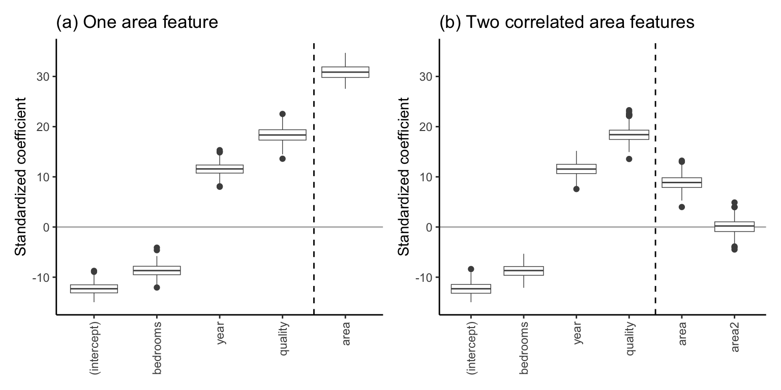 Notice that when we include the additional highly correlated living area feature (Figure 10.4(b)), the magnitude of the area coefficient decreased dramatically compared with the original version in Figure 10.4(a). This is an example of instability resulting from collinearity: the inclusion of a single highly correlated variable dramatically changed the value of the original area variable coefficient. The reason is that in the fit with two area features, the influence of the original area feature on the predicted response is now shared with the second total living area variable.