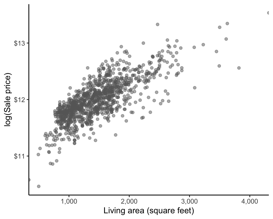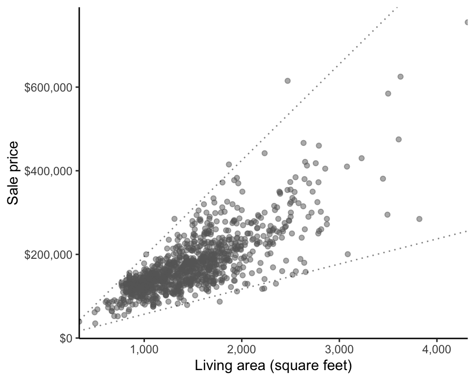 Another instance in which a transformation may help improve poor predictive performance is when there is inconsistent variability in the data, known as heteroskedasticity. Figure 10.1 reproduces the plot of sale price response against living area, placing dashed lines around the general spread of the points. Notice that the points are “fanning out” slightly (i.e., there is slightly more variability in the sale price response of larger houses). This is an example of heteroskedasticity. However, since each data point in the LS loss summation is treated with equal importance, the LS algorithm typically performs best when the variability associated with each observation is relatively consistent (i.e., when there is no heteroskedasticity). Fortunately, certain transformations, such as a log-transformation of the response, can help reduce heteroskedasticity.