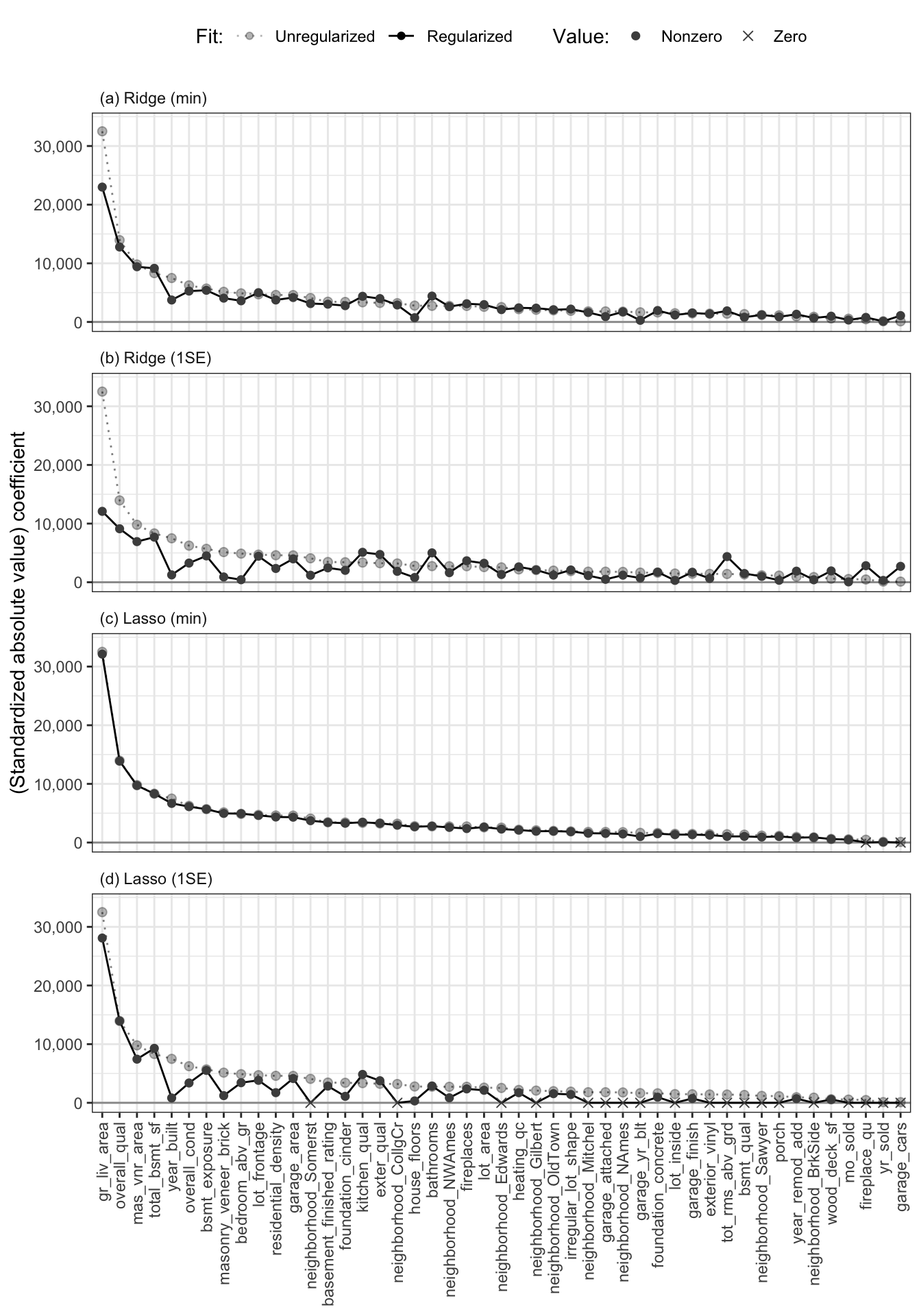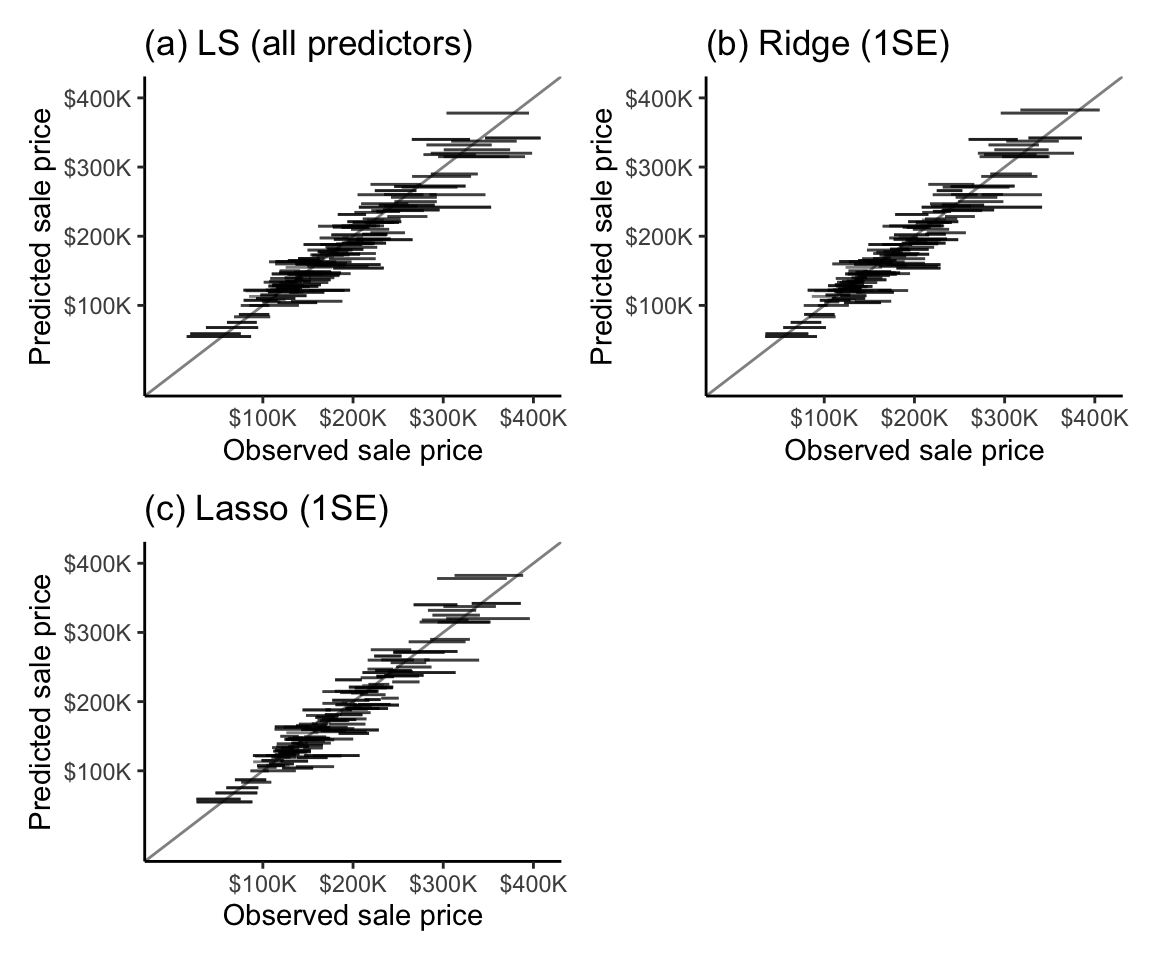 Across each of these performance measures, it is first clear that increasing the number of predictive features included in the linear fit (the final three fits each involve all available predictive features) dramatically improves the predictive performance. When we use just the living area predictor variable to predict sale price (the first row of Table 10.2), the predicted and observed sale price responses have a validation set correlation of 0.696, whereas when we use five features (the second row of Table 10.2), this correlation jumps up to 0.887. Adding the remaining 40+ variables increases the correlation further to 0.942 (the third row of Table 10.2), which implies very good predictive performance. Regularization (in the form of ridge or lasso with \(\lambda_{1SE}\)) does not seem to meaningfully improve the validation set predictive performance compared with the original unregularized LS fit (all predictors).