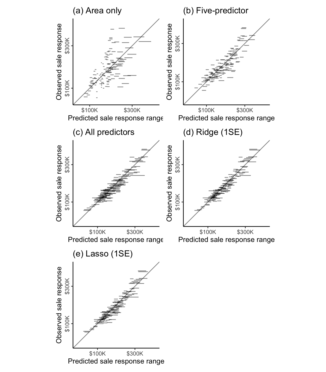 While all the fits yield an observed-predicted response correlation of above 0.91 for the validations set houses (which is quite good correlation performance), there are clearly some judgment calls that led to decreased/increased predictive performance. For instance, it is clear from Figure 10.12(e) that applying a log transformation to the response variable substantially improves the predictive performance (relative to not transforming the response), and Figure 10.12(f) indicates that implementing a correlation feature selection procedure (with a threshold of 0.5) substantially decreases the prediction performance. The other judgment calls don’t seem to have much of an impact on the predictive performance.