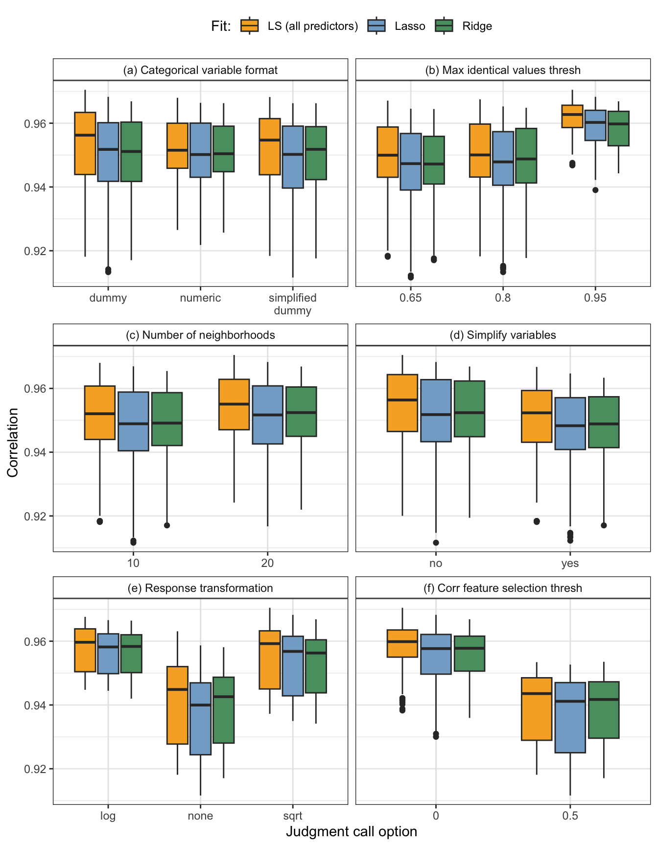 Next, recall that we made several preprocessing judgment calls when preparing the data for the LS algorithm. Examples of the judgment calls that we made include the number of neighborhoods to aggregate, converting ordered categorical levels to numeric values versus one-hot encoded binary variables (see Section 10.2), the missing value threshold for removing variables, whether to simplify several variables, whether to log-transform the response (see Section 10.3), and the correlation feature selection threshold (see Section 10.4).
