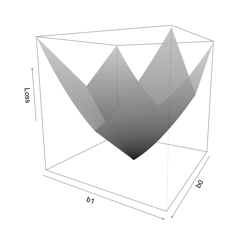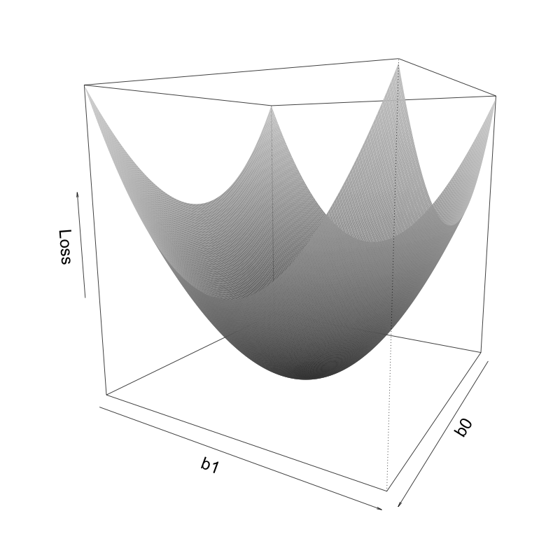 One way that we could get around this issue (i.e., force a stable solution) is by “pulling up” the sides of this loss surface to create a clearer minimum, as in Figure 10.6. Mathematically, this involves adding a regularization constraint to the coefficients when calculating the LS solution, which means that the loss artificially increases as the values of \(b_0\) and \(b_1\) move farther from a particular point, usually chosen to be the point at which \(b_0 = 0\) and \(b_1 = 0\). Since the LS algorithm is trying to minimize the loss, this forces \(b_0\) and \(b_1\) to stay relatively close to \(b_0 = 0\) and \(b_1 = 0\).