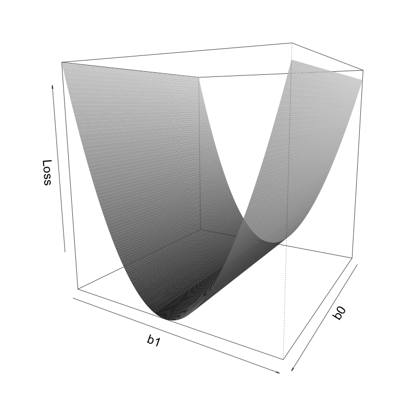 How can regularization help with instability? Let’s start by considering the format of the original unregularized LS loss. Figure 10.5 displays a three-dimensional (3D) surface in which the vertical position (height/\(z\)-axis) of the surface corresponds to the value of the LS squared loss function for a range of values of the intercept \(b_0\) and the area coefficient \(b_1\) (\(x\)- and \(y\)-axes), based on the single-predictor linear fit, \(\textrm{predicted price} = b_0 + b_1 \textrm{area}\).