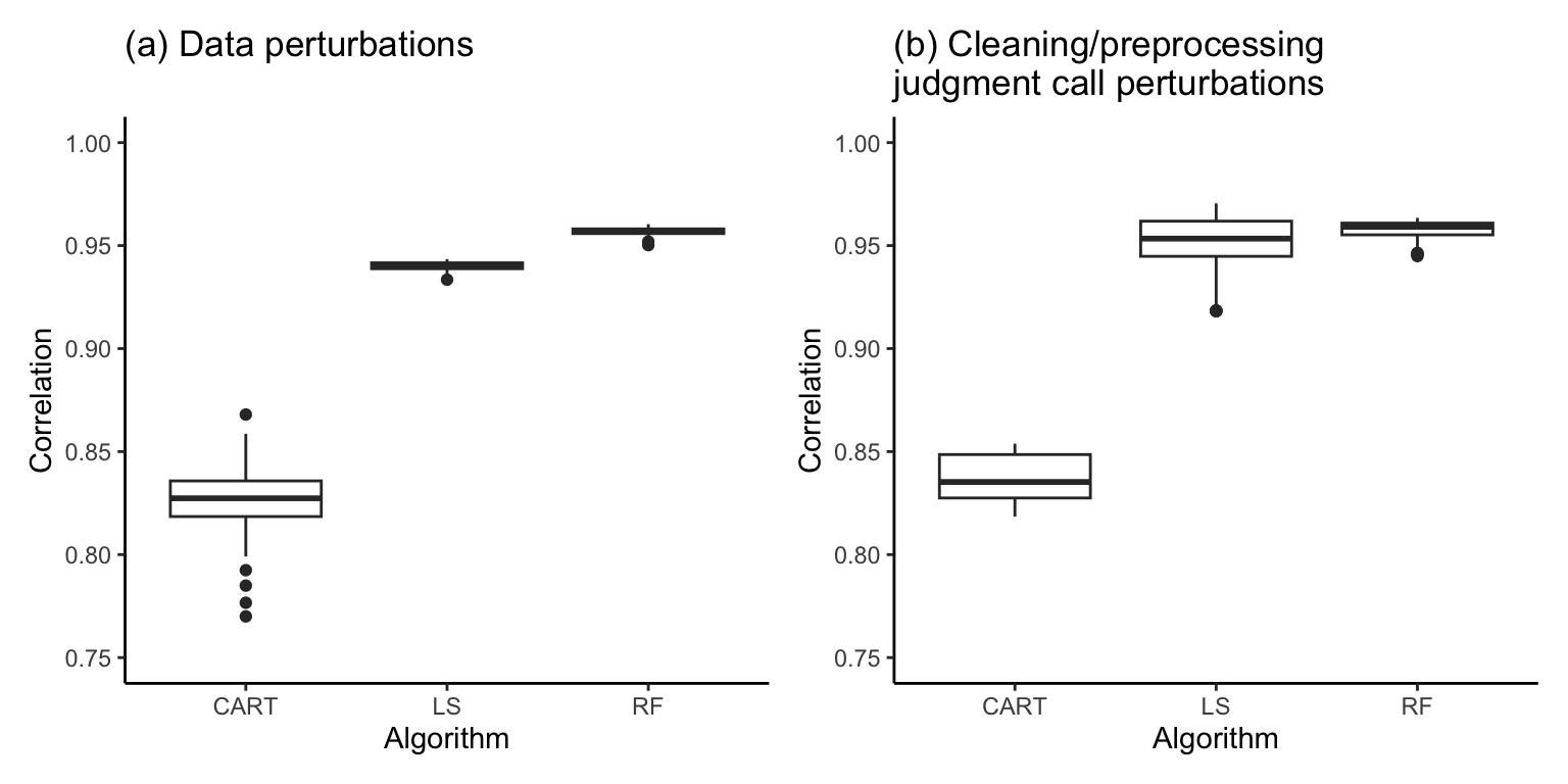 Figure 12.12 shows the distribution of the relevant validation set correlation performance measure for the continuous response Ames house price project fits for each algorithm trained on each of (a) the 100 different data–perturbed versions of the default cleaned/preprocessed Ames training dataset, and (b) the 336 different cleaning/preprocessing judgment call–perturbed versions of the training dataset. Overall, the RF algorithm correlation performance measure seems to be very stable relative to the other algorithms.