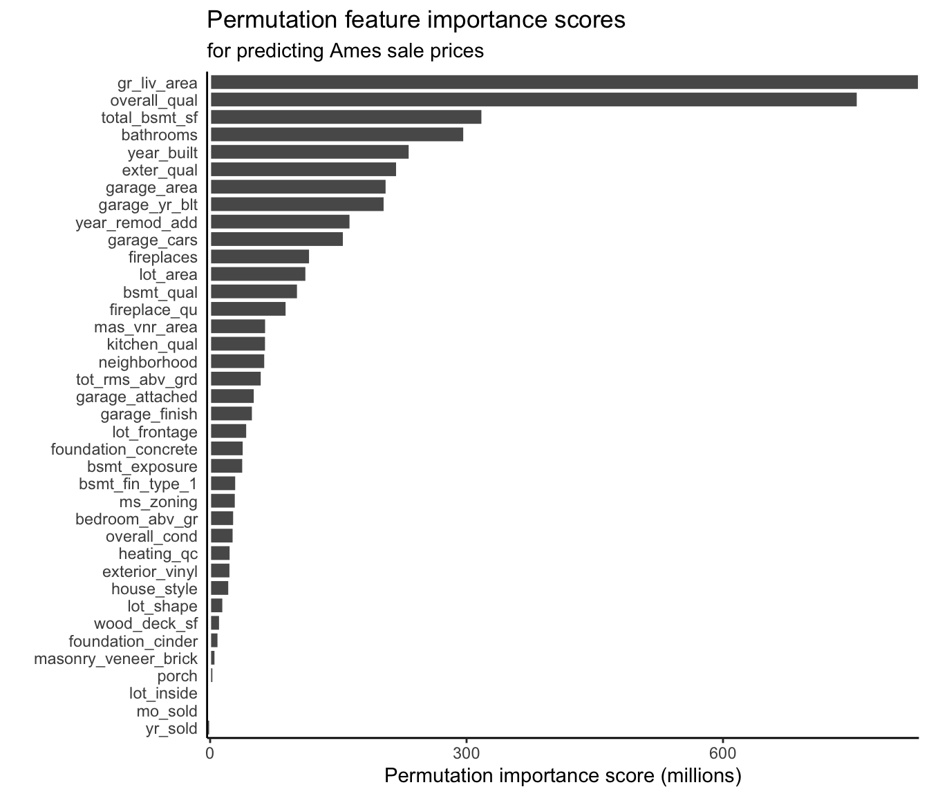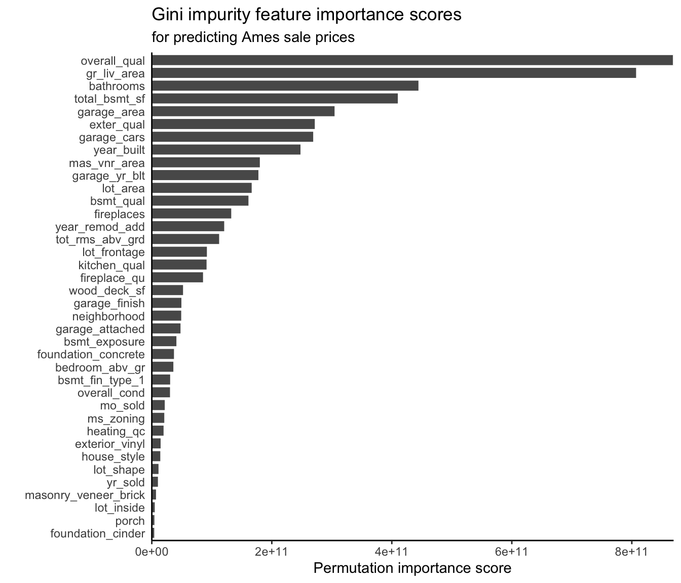 For the continuous response RF algorithm (with default hyperparameters) trained to predict house sale prices in Ames, Iowa, the permutation feature importance scores are shown in Figure 12.5. As with our LS coefficient-based findings, we again find that the most important features are the greater living area and the overall quality score.