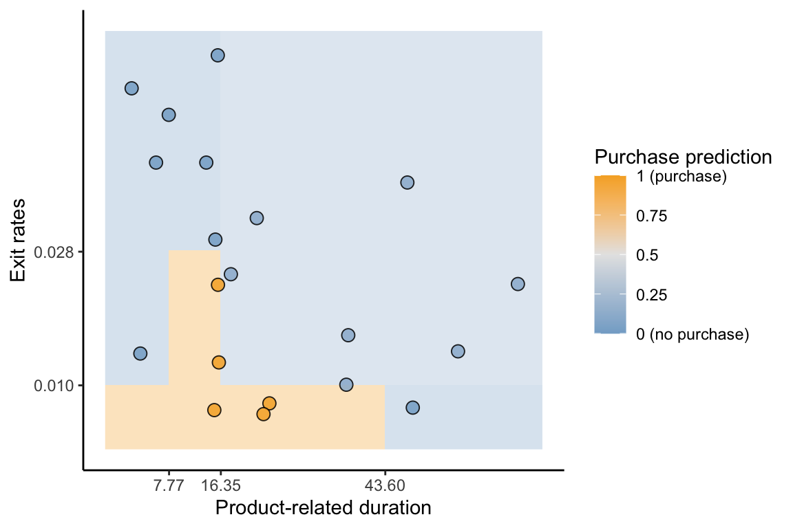 Figure 12.3 shows the decision boundary for the two-predictor (exit rates and product-related duration) CART algorithm for predicting the probability of a purchase based on the decision tree in Figure 12.1. The color of the background corresponds to the purchase (positive class) probability prediction for a new data point in that location. Each distinct rectangle corresponds to a split in the decision tree from Figure 12.1. Compare the CART classification boundary in Figure 12.3 to the logistic regression classification boundary in Figure 11.7 in Chapter 11. Unlike the logistic regression classification boundary, the CART decision boundary is made up of discrete blocks of constant positive class probability predictions.
