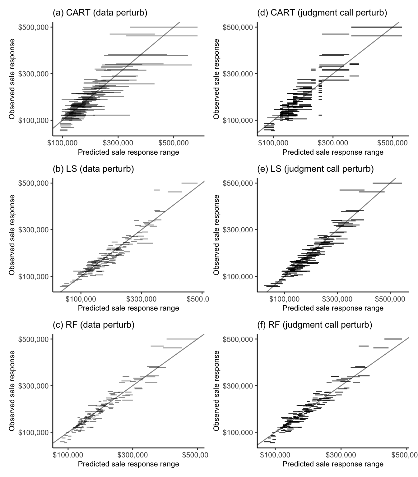 It is clear from Figure 12.11(c) and (f) that the RF algorithm is substantially more stable to both the data perturbations and cleaning and preprocessing judgment call perturbations than both the CART and LS algorithms. Indeed, the average standard deviation of the individual data-perturbed validation set sale price predictions from the RF algorithm is $3,970 (compared with $19,449 for the CART algorithm and $5,827 for the LS algorithm). Similarly, the average SD of the cleaning/preprocessing judgment call-perturbed RF sale price predictions for the validation set houses is $4,901 (compared with $11,875 for the CART algorithm and $9,330 for the LS algorithm).