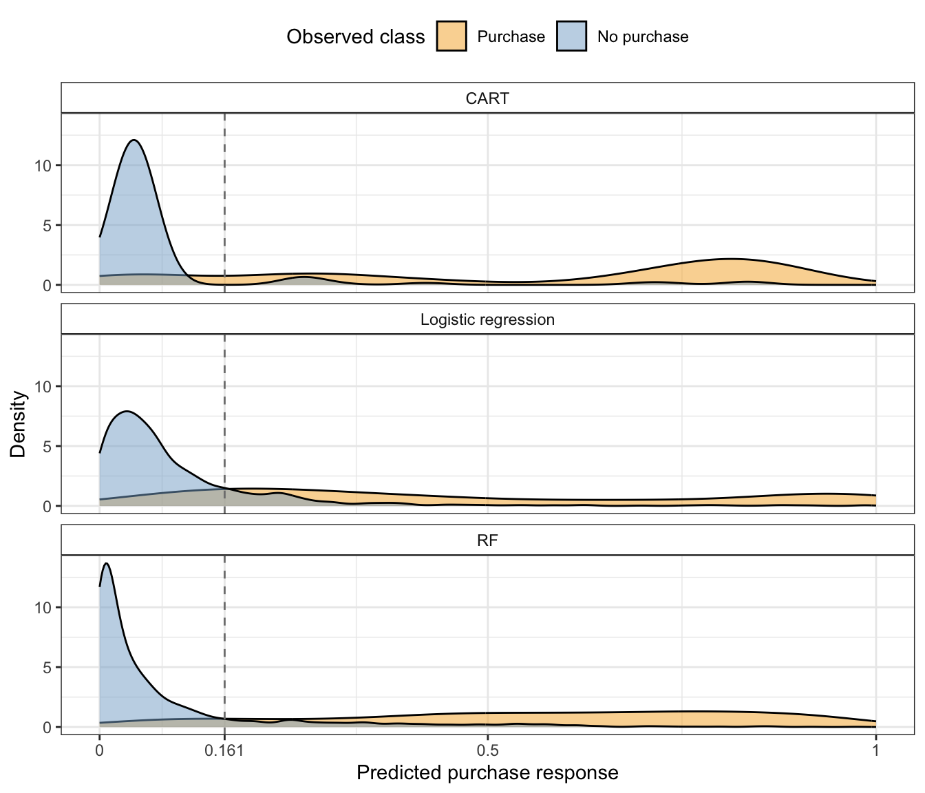 Finally, Figure 12.10 shows the distribution of the CART, logistic regression, and RF predicted purchase probabilities for the validation sessions for each class. For each algorithm, we see that there is a clear peak of low purchase probability values for the sessions that did not result in a purchase, and this peak is centered farther to the left for the RF algorithm relative to the CART and logistic regression algorithms (indicating that the RF algorithm is better at correctly detecting when a session is unlikely to end in a purchase). The predicted probabilities for the sessions that did end in a purchase are spread fairly evenly throughout the entire probability range for all three algorithms (indicating that none of them can easily detect when a session is likely to result in a purchase).