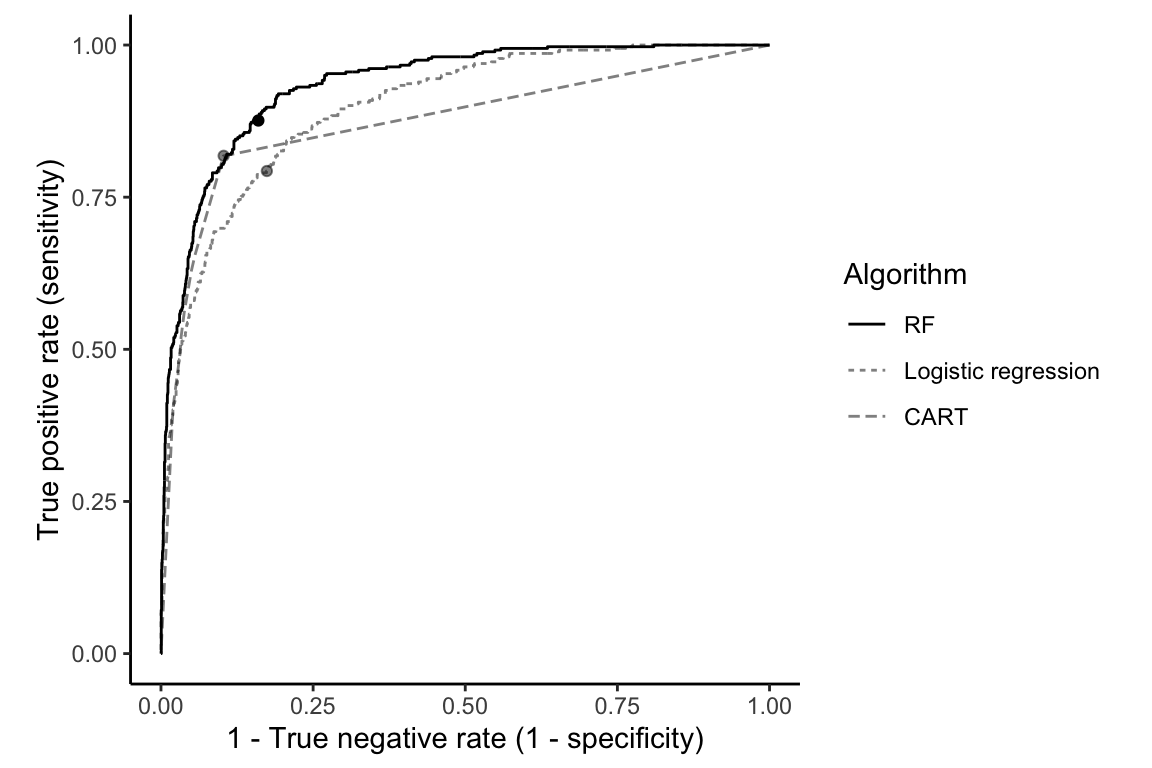 The fact that the RF ROC curve almost always sits above the other two ROC curves implies that there are threshold values for which the RF algorithm can always achieve a higher true positive rate for a given true negative rate (although the threshold may not have the same value for each algorithm).