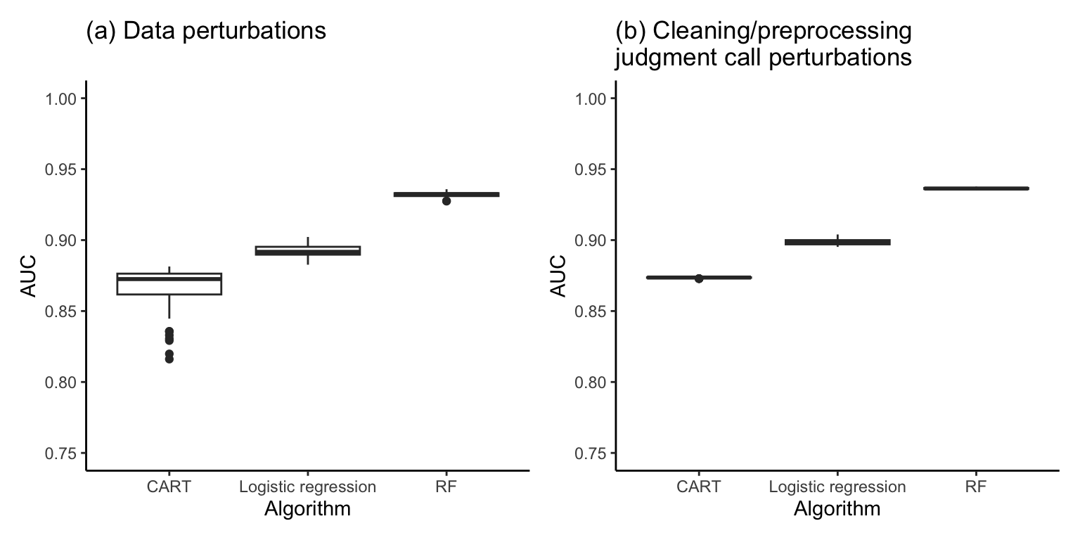 The data and cleaning/preprocessing judgment call perturbations that we will consider in this section are summarized in Section 11.5.2 of Chapter 11. Figure 12.13 shows the distribution of the validation set AUC across the (a) 100 data-perturbed and (b) the 16 cleaning/preprocessing–perturbed versions of each CART, logistic regression, and RF algorithm for predicting online shopping purchase intent. Notice that the AUC performance is very stable in each case (the widths of the boxplots are very narrow, indicating that the performance barely changes at all across the data and cleaning/preprocessing judgment call perturbations).