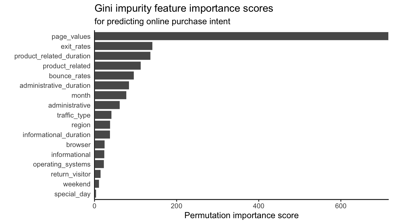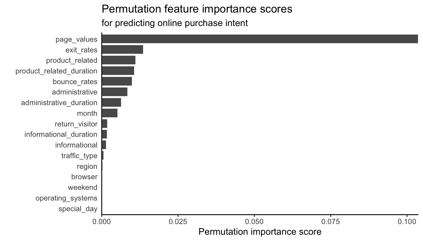 For the binary response RF algorithm (with default hyperparameters) trained to predict the purchase intent of online shopping sessions, the permutation feature importance scores are shown in Figure 12.6. It seems as though the page values feature is again the most important feature (matching what we found when looking at the standardized coefficients from the LS and logistic regression fits from Chapter 11).