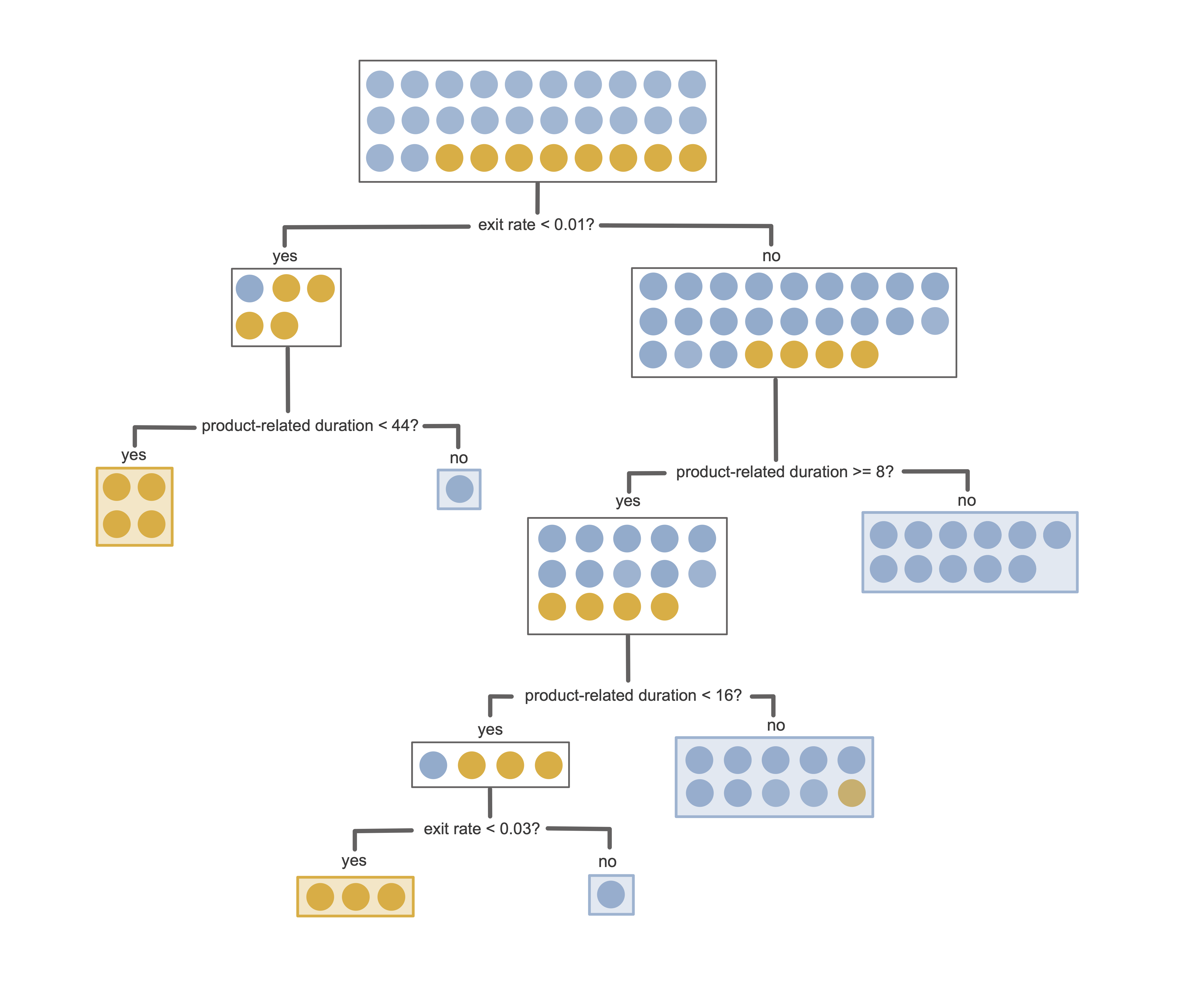 Just like a flowchart, a binary decision tree involves a series of binary questions arranged in a tree-like fashion. Each binary question involves asking either (1) whether the value of a continuous predictive feature is above or below a specific threshold value, such as “Did the user spend more than 20 minutes on product-related pages during their session?” (the continuous feature is the “product-related duration” and the threshold is 20), or (2) whether the value of a categorical predictive feature is equal to a specific level, such as “Did the session take place in December?” (where, for this example, the categorical feature is “month” and the level is “December”). Note that unlike the LS and logistic regression algorithms, algorithms that are based on decision trees can use categorical predictive features without requiring that they be converted to numeric (e.g., one-hot encoded dummy) variables.2