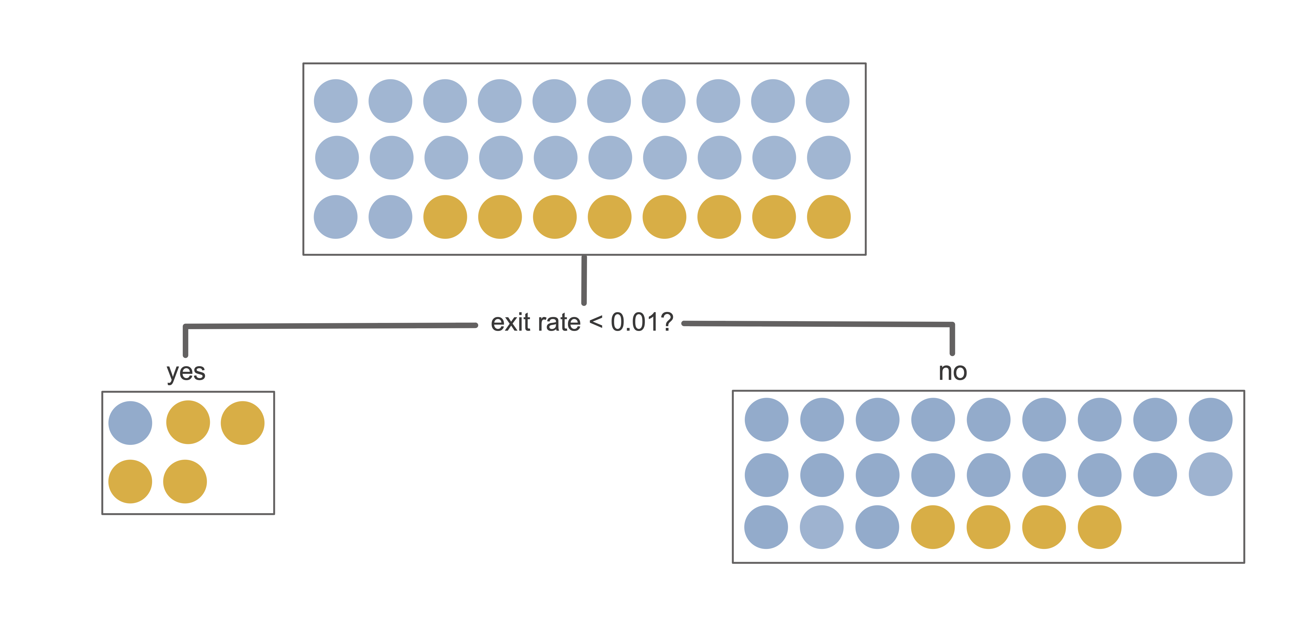 To see the Gini impurity in action, let’s use it to evaluate the first split from the binary online purchase intent prediction problem decision tree from Figure 12.1. This first split, shown in Figure 12.2, involves asking if “exit rates < 0.01?”
