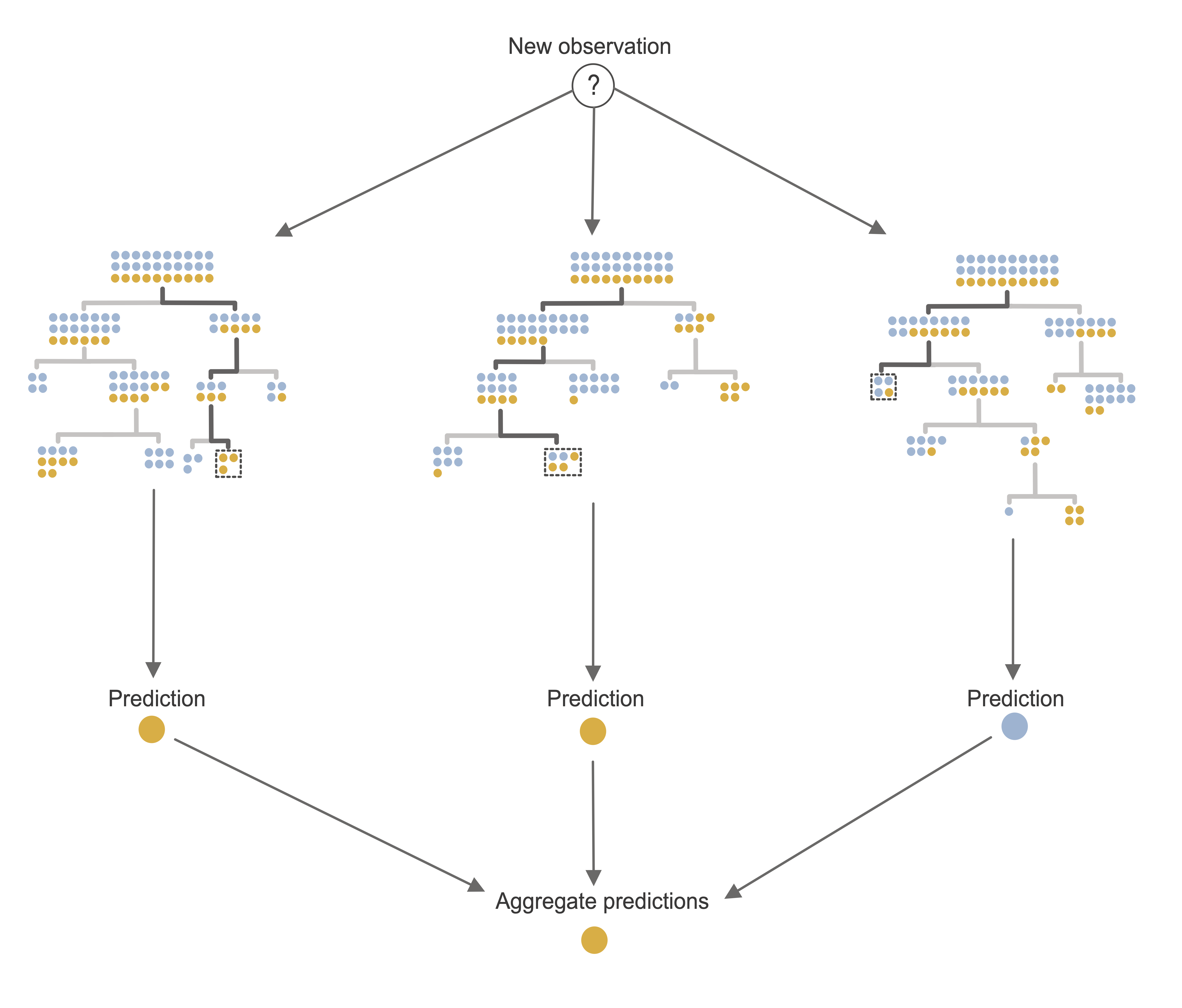 The end result is a collection of decision trees, each capturing a slightly different snapshot of the patterns and relationships in the training data. Intuitively, this means that it is more likely that such a forest-based algorithm will be able to generalize to new data that is slightly different from the training dataset. As a general principle, the more independent the trees are from one another, the more accurate and generalizable the RF ensemble predictions they generate will be (however, each tree must still be a reasonable representation of the original data).