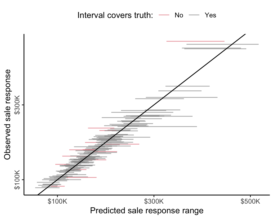 To give a final independent assessment of the coverage of our PPIs for new observations, we need to again turn to the test set. When we create calibrated PPIs for the test set houses (using the same calibration constant as above, \(\gamma = 2.04\)), the coverage is equal to 88 percent (i.e., 88 percent of the calibrated test set PPIs contain the observed response), which is fairly close to our goal of 90 percent.