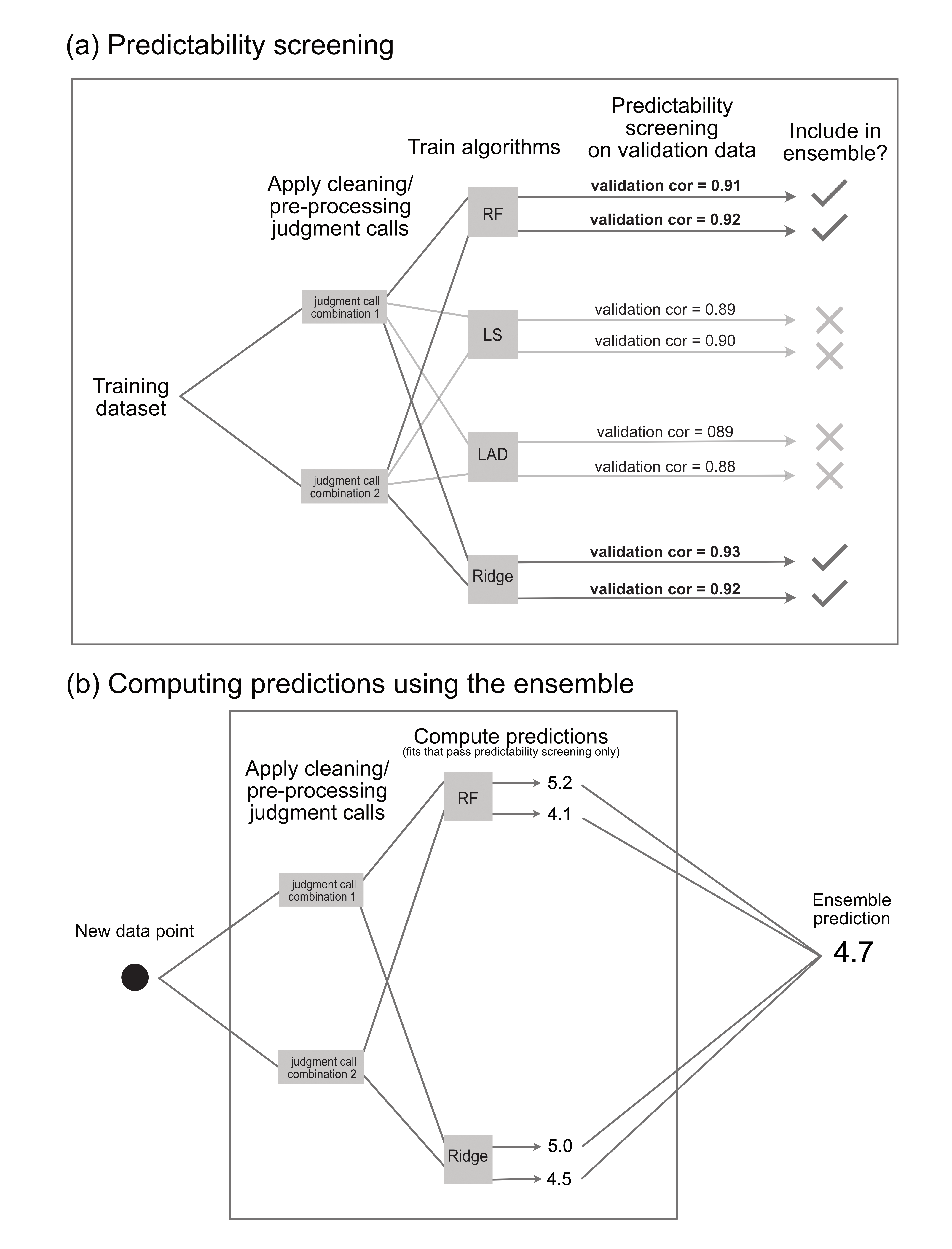 By creating an ensemble of several different PCS predictive fits, we can combine the different patterns that are being captured across the individual fits. It seems plausible that by combining multiple plausible predictions, you might be able to improve the predictive performance (this is sometimes the case even when the individual base learners themselves have poor predictive performance). Before creating an ensemble, however, we conduct predictability screening to ensure that we include only the best-performing fits in our ensemble (e.g., the 10 percent of fits with the best validation set performance). The precise format of the predictability screening must be determined separately for each domain problem and is typically based on domain knowledge.