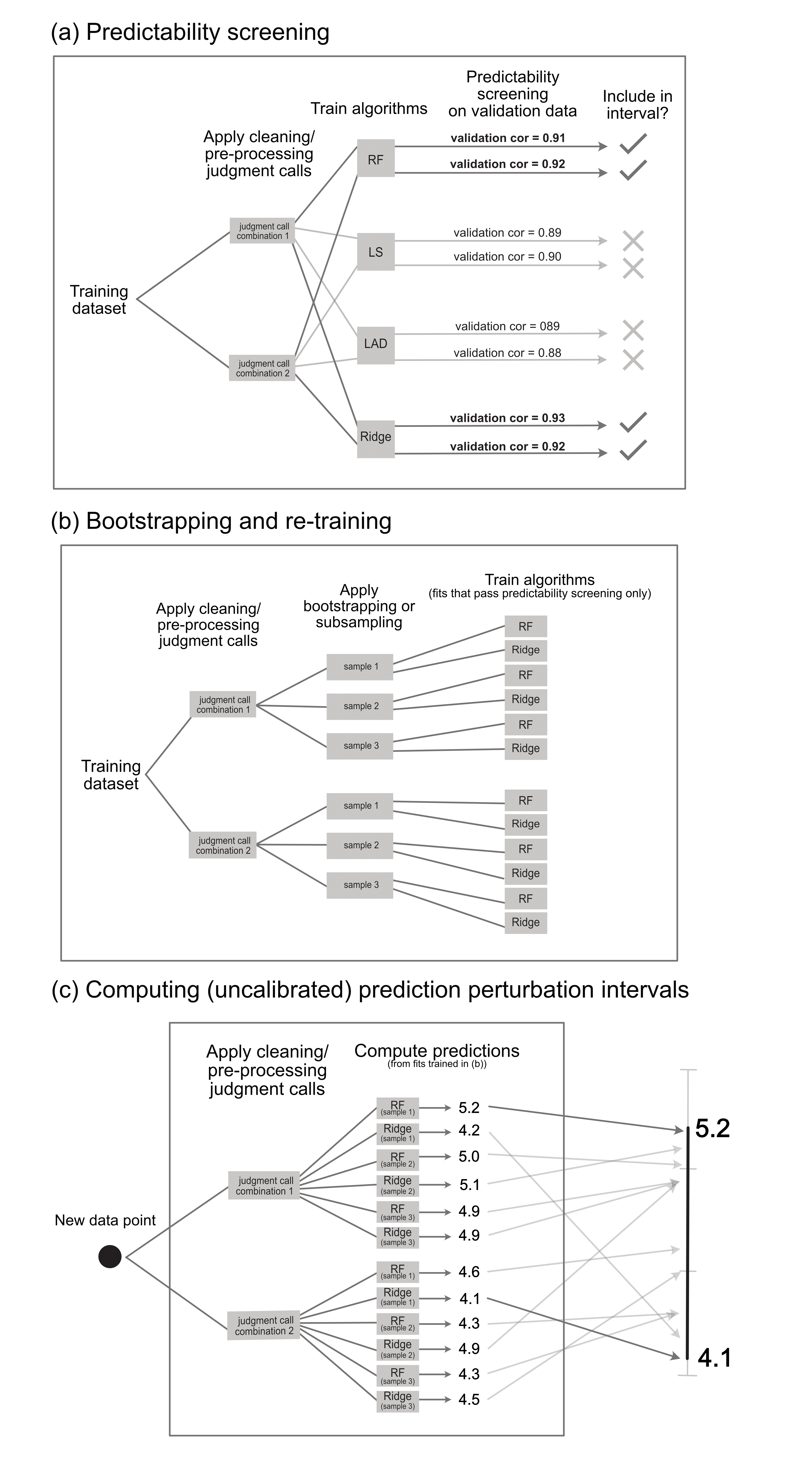 Let’s wrap up this section with a summary of the process of computing calibrated PPIs (recall that this is just one suggested approach for computing PPIs—there are many possible ways to incorporate the perturbations when forming an interval). Note that the predictability screening step is the same as for the ensemble approach: