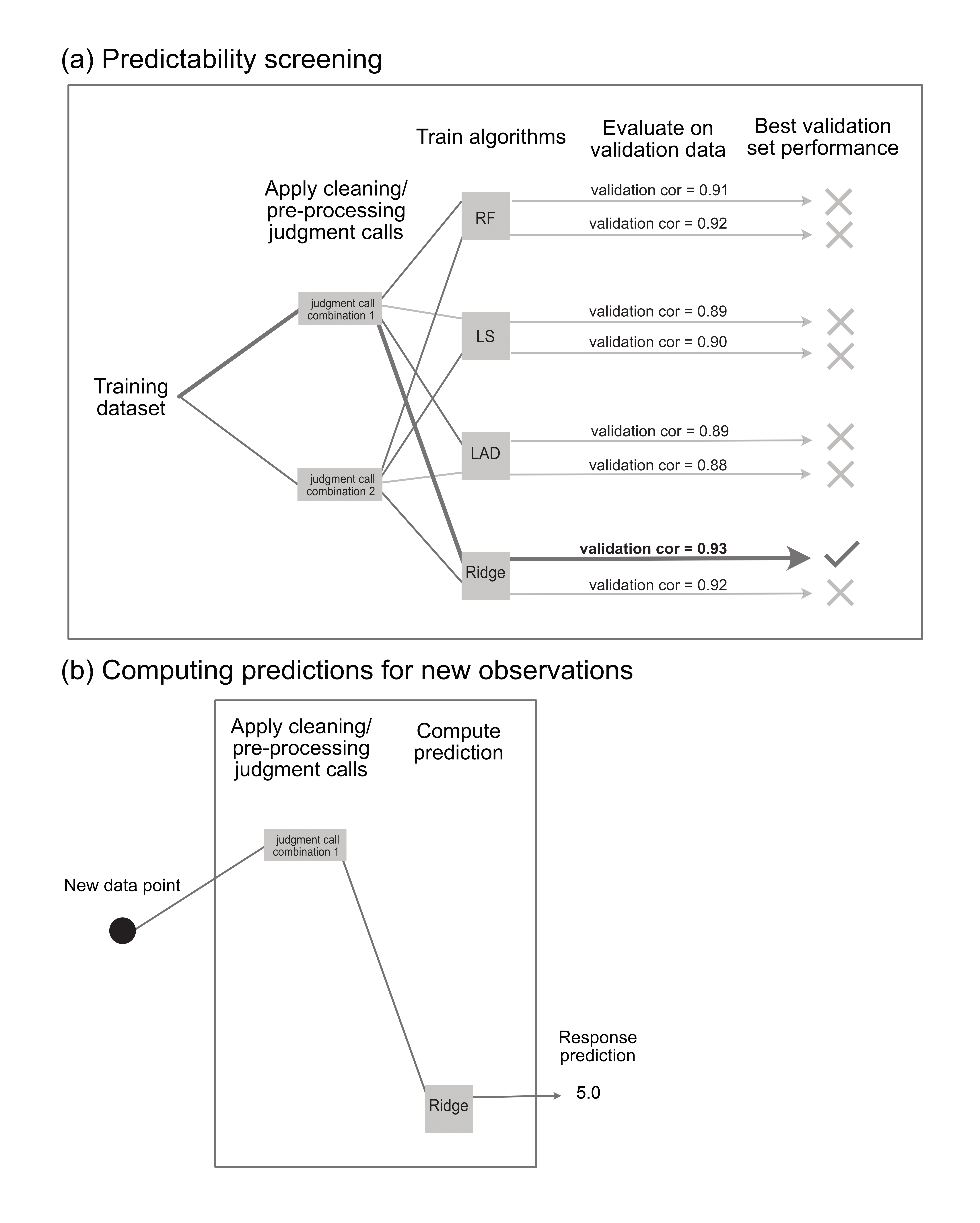 Figure 13.1(a) depicts the process of choosing the single PCS predictive fit that achieves the best validation set predictive performance across four algorithms, each trained on two different cleaned/preprocessed versions of the training data, corresponding to eight predictive fits in total. (Note, however, that in practice, you will generally have many more than two alternative cleaning/preprocessing judgment call combinations.) Having identified the best PCS predictive fit, Figure 13.1(b) depicts using this fit to compute a response prediction for a new data point.